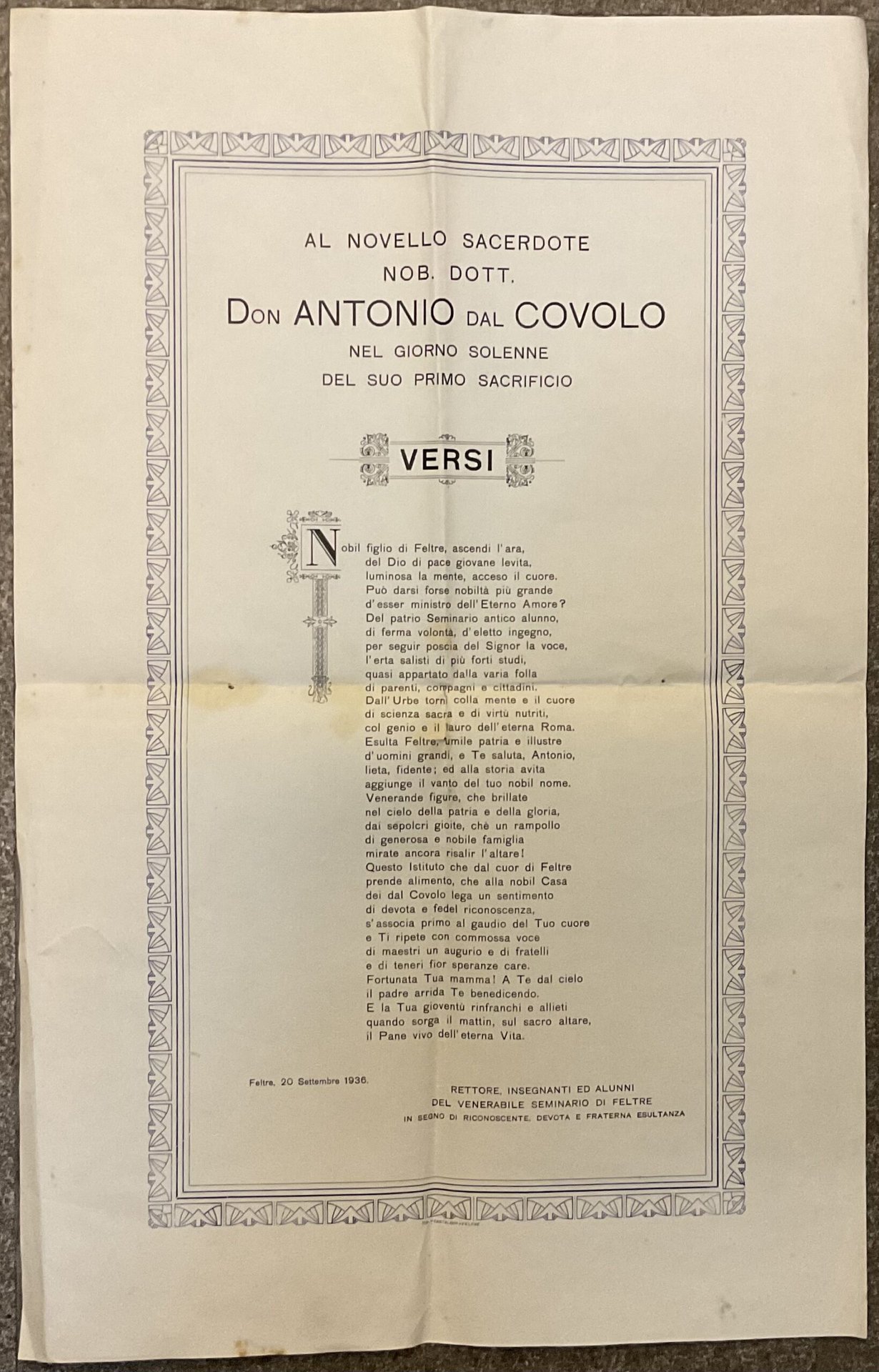 Al novello sacerdote Nob. Dott. Don Antonio Dal Covolo nel giorno solenne del suo primo sacrificio