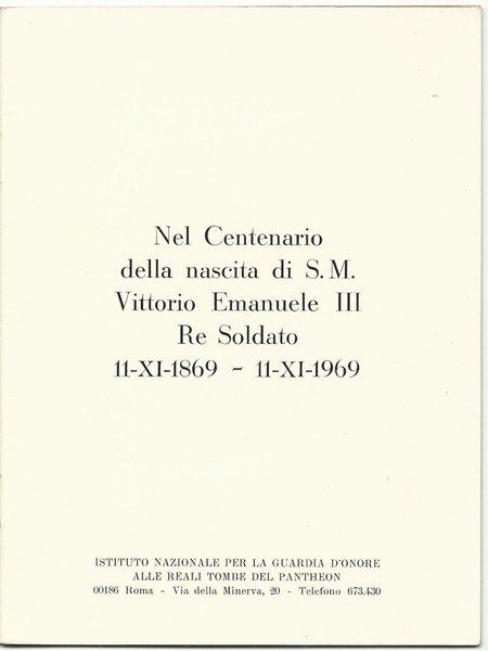 Nel Centenario della nascita di S.M. Vittorio Emanuele III Re Soldato 11 - XI - 1869 - 11 - XI - 1969. Istituto Nazionale per la Guardia d'Onore alle Reali Tombe del Pantheon, 1969. Con prefazione, foto, documenti ed elenco dei sottoscrittori. In fine Calendario per l'anno 1970. Cartoncino editoriale. 14,5x19; pp.12. Raro e in Stato di Nuovo. ,
