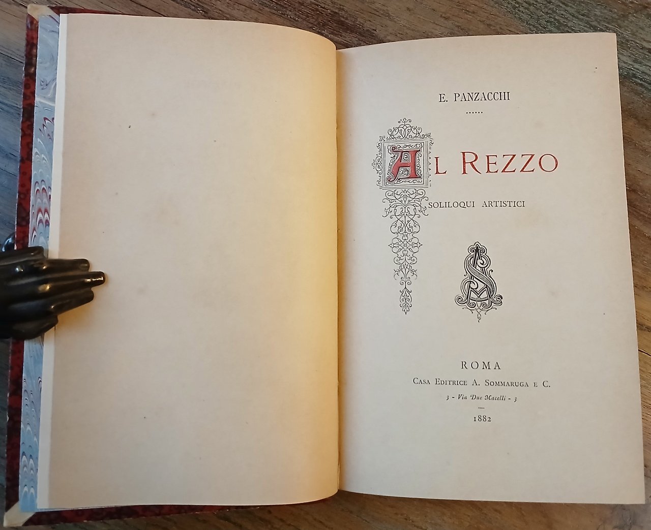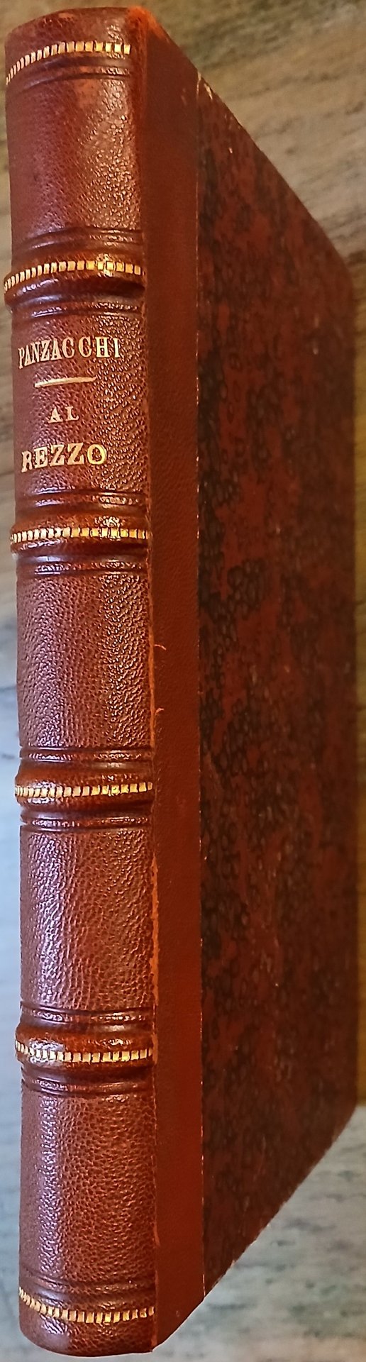 In 16° grande, legatura coeva in mezza pelle rossa, dorso a 4 nervi con titoli e filetti impressi in oro, carta marmorizzata monocroma ai piatti, guardie in carta pavone, pp. (8),218,(6), frontespizio in rosso e nero, testatine, capolettera e finalini tipografici. Volume solido e ben conservato, stampato nella tipografia dei Fratelli Centenari con caratteri della Fonderia Rayper sopra carta della Fabbrica Lammi in edizione di 1000 copie.