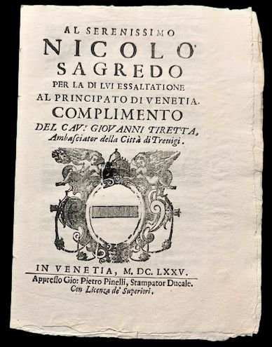 In 4° (20,5x15,5 cm); (8) pp. Senza brossura e a fogli sciolti. Esemplare in barbe ed in ottime condizioni di conservazione. Lo stesso anno uscì un'edizione identica stampata a Treviso da Pasqualin da Ponte. Rara placchetta che contiene un'orazione del Cavaliere Giovanni Tiretta, appartenente alla nobile famiglia trevigiana dei Tiretta, ambasciatore della città di Treviso, dedicato al nuovo doge di Venezia, Nicolò Sagredo (Venezia, 18 dicembre 1606 Venezia, 14 agosto 1676). Sagredo fu il 105º doge della Repubblica di Venezia e ricoprì la carica dal 6 febbraio 1675 fino alla sua morte avvenuta il 14 agosto del 1676. Il suo periodo di reggenza fu breve ma passò alla storia per il lusso e le ricche feste che diede. Rimane, in particolare, celebre la festa dello sposalizio del mare del 1675 per il grande sfarzo e gli innumerevoli divertimenti che il Doge donò alla cittadinanza. Rarissima placchetta in barbe ed in ottime condizioni di conservazione. Rif. Bibl.: ICCU IT\ICCU\VIAE\007754.