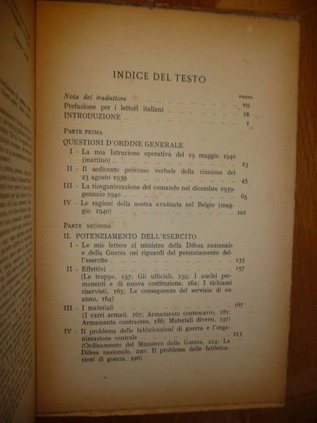 DESCRIZIONE: Rizzoli Milano 1947 I^ Ed., br. ed. SENZA SOVRACC. pp. 402 in 8°. L’A., comandante dell’esercito francese durante la terribile disfatta del 1940, attraverso la narrazione degli avvenimenti di guerra e dei precedenti di pace, cerca di difendersi dalle imputazioni che gli furono mosse al processo di Rion dal Governo di Vichy. Un'appassionata autodifesa ed aspra requisitoria politico-militare di chi fu a capo dell'esercito francese dal Settembre 1939 al pauroso sfacelo del Maggio 1940. Un testo per capire meglio uno degli piu' inaspettati cedimenti militari. Indice completo in foto. CONDIZIONI: Accettabili, copertina con parziale rottura alla parte alta, danni al dorso, interni buoni. PESO / WEIGHT: 477 gr. without package
