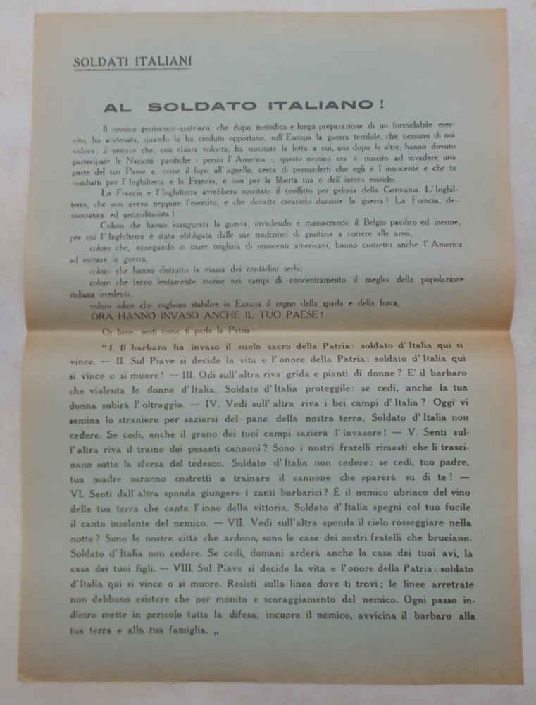 Foglio volante di cm. 35,5 x 25,5 stampato su carta colorata, con traccia di piega, ma eccezionalmente ben conservato. VG. ** Il volantino contiene , tra l'altro, queste frasi: “… coloro che vogliono stabilire in Europa il regno della spada e della forca, ORA HANNO INVASO ANCHE IL TUO PAESE!. Sul Piave si decide la vita e l’onore della Patria: soldato d’Italia, qui si vince o si muore!. Resisti sulla linea dove ti trovi…” Questi volantini destinati ai soldati italiani attestati sul Piave in un momento decisivo della Grande Guerra provengono dalla famiglia di un pilota che compì numerose missioni aeree durante il conflitto e che in seguito fu ingegnere progettista della Aeroplani Gabardini di Cameri. Perciò avevo pensato che fossero lanciati dagli aerei sulle linee. Ma un esperto editore di opere sulla 1^G.M. mi ha spiegato che più probabilmente venivano distribuiti a mano alle truppe “quasi certamente soprattutto ai sottufficiali, che, visto l’altissimo tasso di analfabetismo tra i soldati, avevano il compito di leggerli alla truppa”.