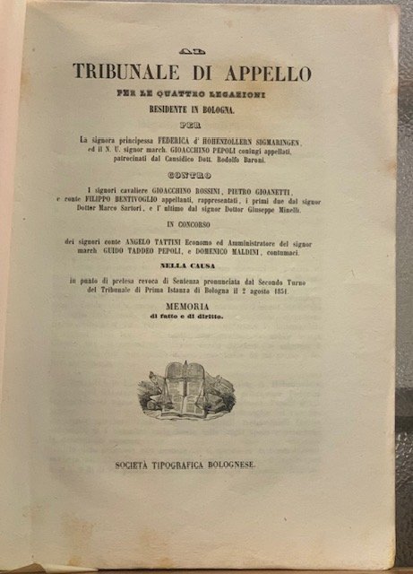 AL TRIBUNALE DI APPELLO PER LE QUATTRO LEGAZIONI RESIDENTE IN BOLOGNA. PER LA SIGNORA PRINCIPESSA FEDERICA D'HOHENZOLLERN SIGMARINGEN, GIOACCHINO PEPOLI CONTRO GIOACCHINO ROSSINI, PIETRO GIOANETTI E FILIPPO BENTIVOGLIO.ecc, IN CONCORSO DEI SIGNORI CONTE ANGELO TATTINI, GUIDO TADDEO PEPOLI E DOMENICO MALDINI, CONTUMACI. ecc, ecc.