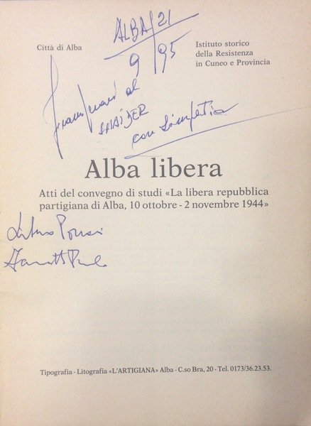 Atti del Convegno di studi La libera repubblica partigiana di Alba. Volume dell'Istituto storico della Resistenza in Cuneo e Provincia, pp 243. Firma di Libero Porcari.