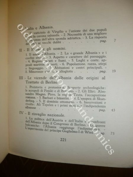 DESCRIZIONE: Cetim Milano 1939 br. ed. ill. col., pp. 222 con 1 cart. geogr. in 8°. Bel volume che illustra la storia dell'Albania e i suoi rapporti con l'Italia sino all'occupazione. Ampi capitoli riguardano le risorse economiche e gli aspetti sociale del paese. CONDIZIONI: Ottime, piccolo strappetto alla cop. PESO / WEIGHT: 250 gr. without package