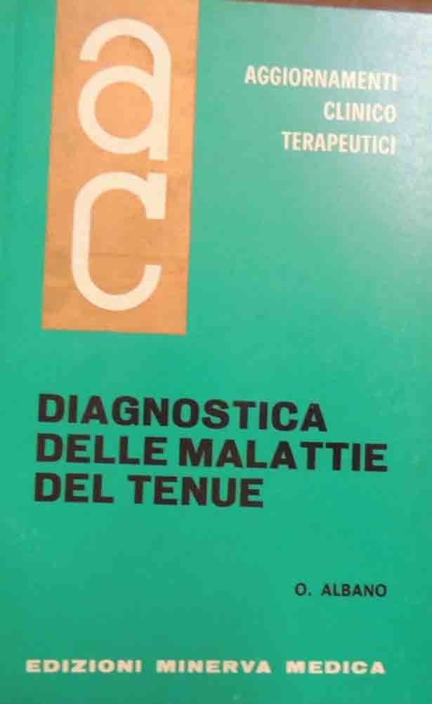 O. Albano, Diagnostica delle malattie del tenue, numero monografico di Aggiornamenti Clinicoterapeutici. Collana monografica mensile, vol. VIII, n. 10, novembre-dicembre 1967, Edizioni Minerva Medica, s.l. (ma stampato a Saluzzo, presso la Tip. Ed. Minerva Medica), pp. 110, cm 22, br. ed. Piccolo timbro di appartenenza alla seconda di copertina, all’occhiello e al frontespizio. Minime tracce d’uso alla brossura, lievissima ingiallitura della carta, per il resto ben conservato.