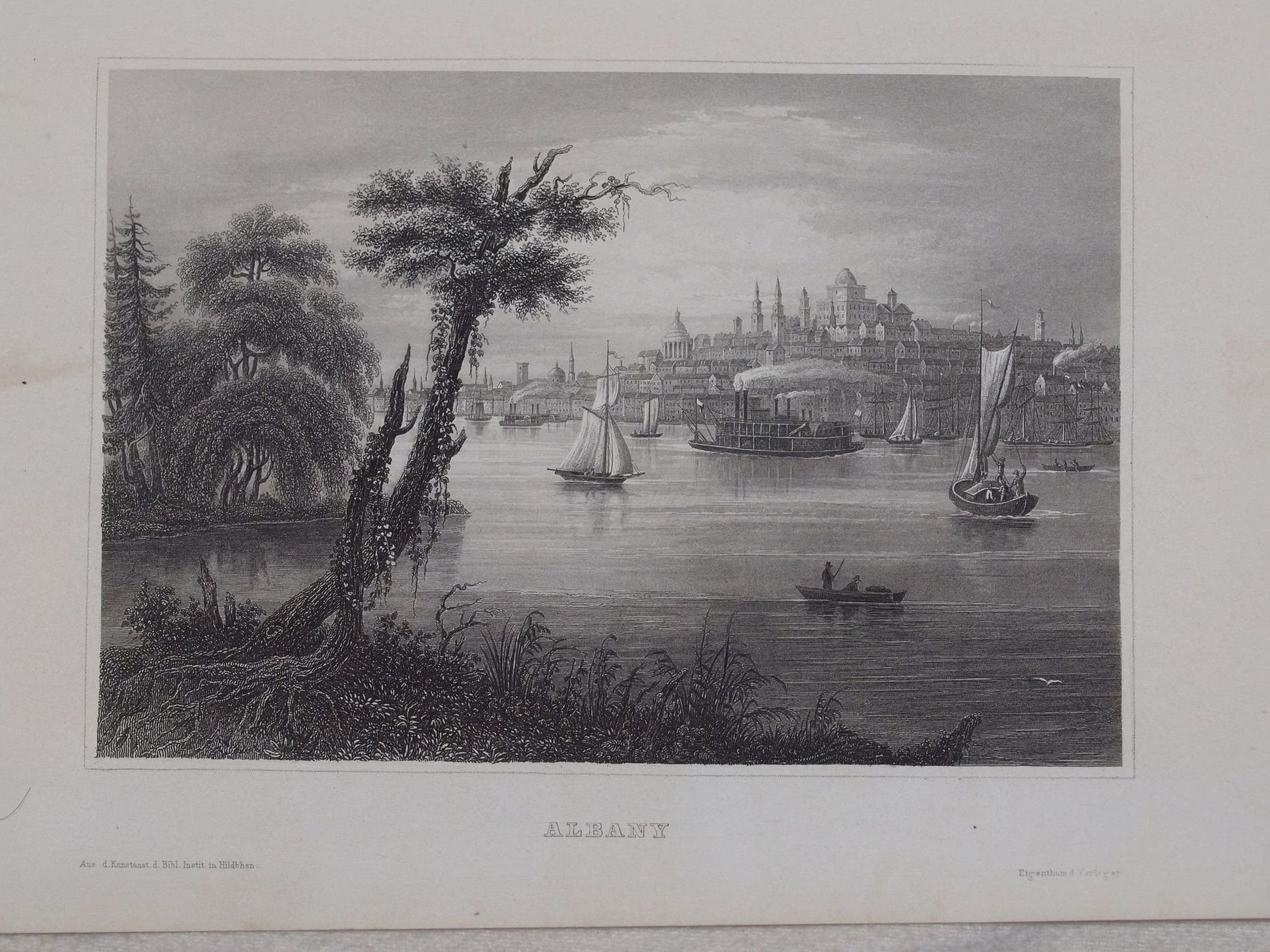 Veduta animata dI Albany, New York del 1850 circa. Autore: Anonimo Atlante: Meyer s Universum 1838-1860 circa Data: 1850 circa Tecnica: Acquaforte su rame Dimensione del foglio: 15,5x23 cm Dimensione incisione: 11x16 cm Condizioni: Buone. Alcune fioriture.Beautiful animated view of Albany of 1840 circa. Date: 1840 circa Atlas: Meyer s Universum 1838-1860 circa Technique: Steel etching Leaf Dimension: 15,5x23 cm (6.1x9.1 inches) Engraving Dimension: 11x16 cm (4.3x6.3 inches) Conditions: Good conditions. Some foxings and worn edge<BR><BR>