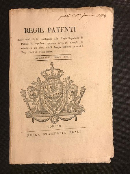 [alberghi] REGIE PATENTI Colle quali S.M. Conferisce alla Regia Segreteria di Polizia la superiore ispezione sovra gli alberghi, le osterie, e gli altri simili luoghi pubblici in tutti i Regii Stati di Terra-ferma. In data delli 2 ottobre 1818.
