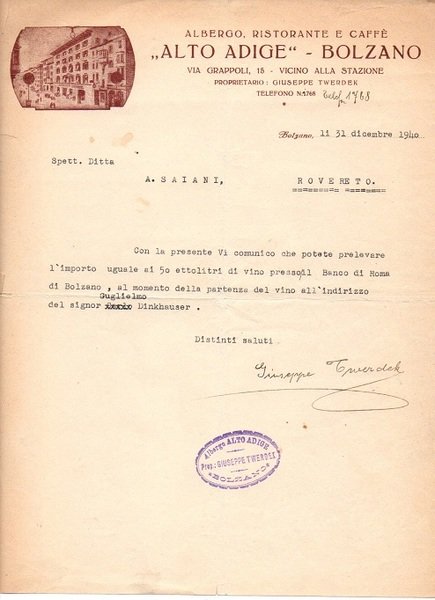 Albergo, ristorante e caffè ”Alto Adige”: Bolzano.