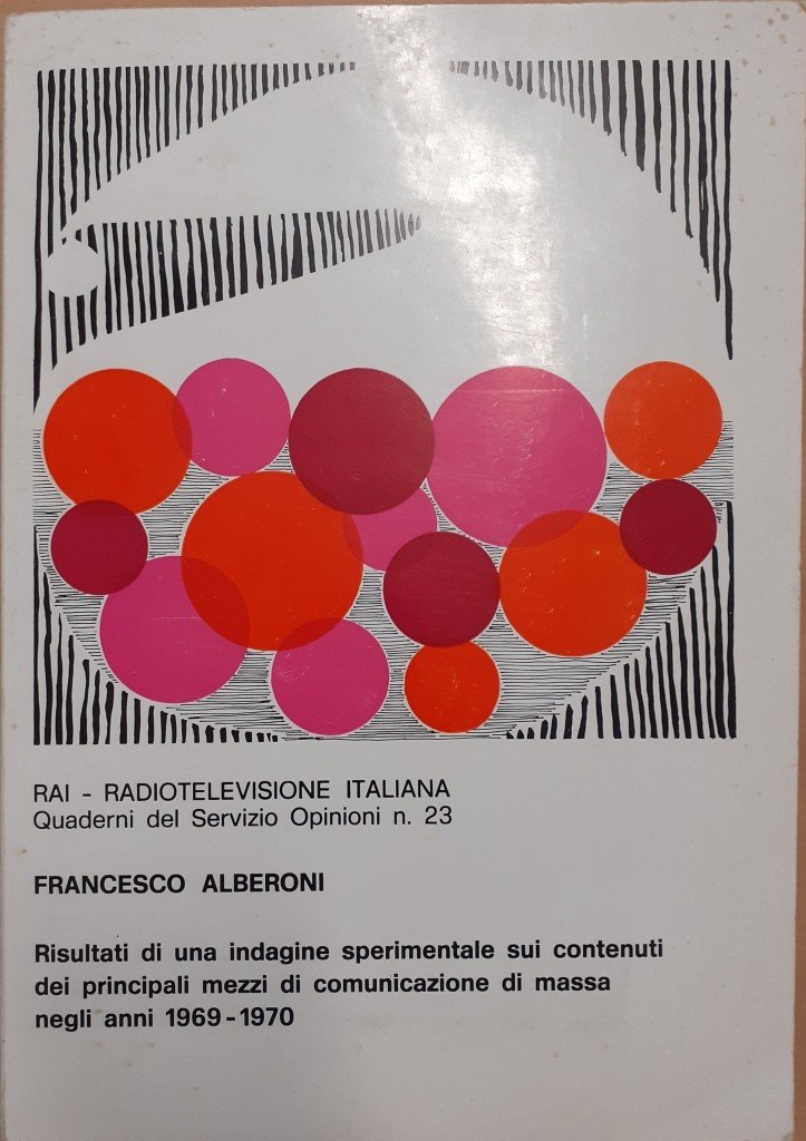 Francesco Alberoni, Risultati di una indagine sperimentale sui contenuti dei principali mezzi di comunicazione di massa negli anni 1969-1970, Eri Edizioni Rai Radioteleviosione Italiana, Torino 1973, pp. VI, 487, tabb., cm 29, br. ed. Collana Quaderni del Servizio Opinioni, n. 23. Volume ricchissimo di grafici e tabelle a tutta pagina. Lievissimi segni del tempo alla brossura, per il resto esemplare in perfetto stato di conservazione. Molto raro.