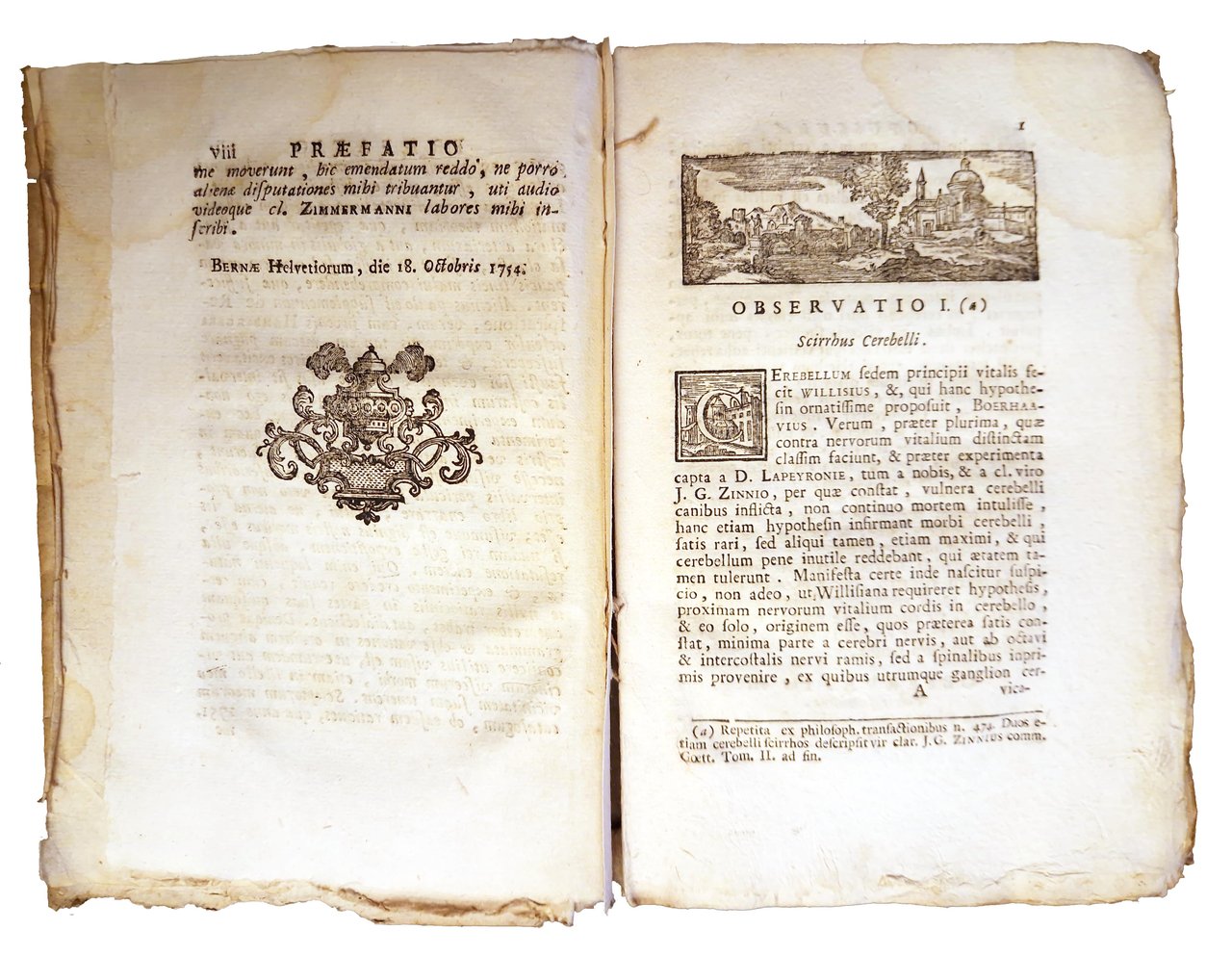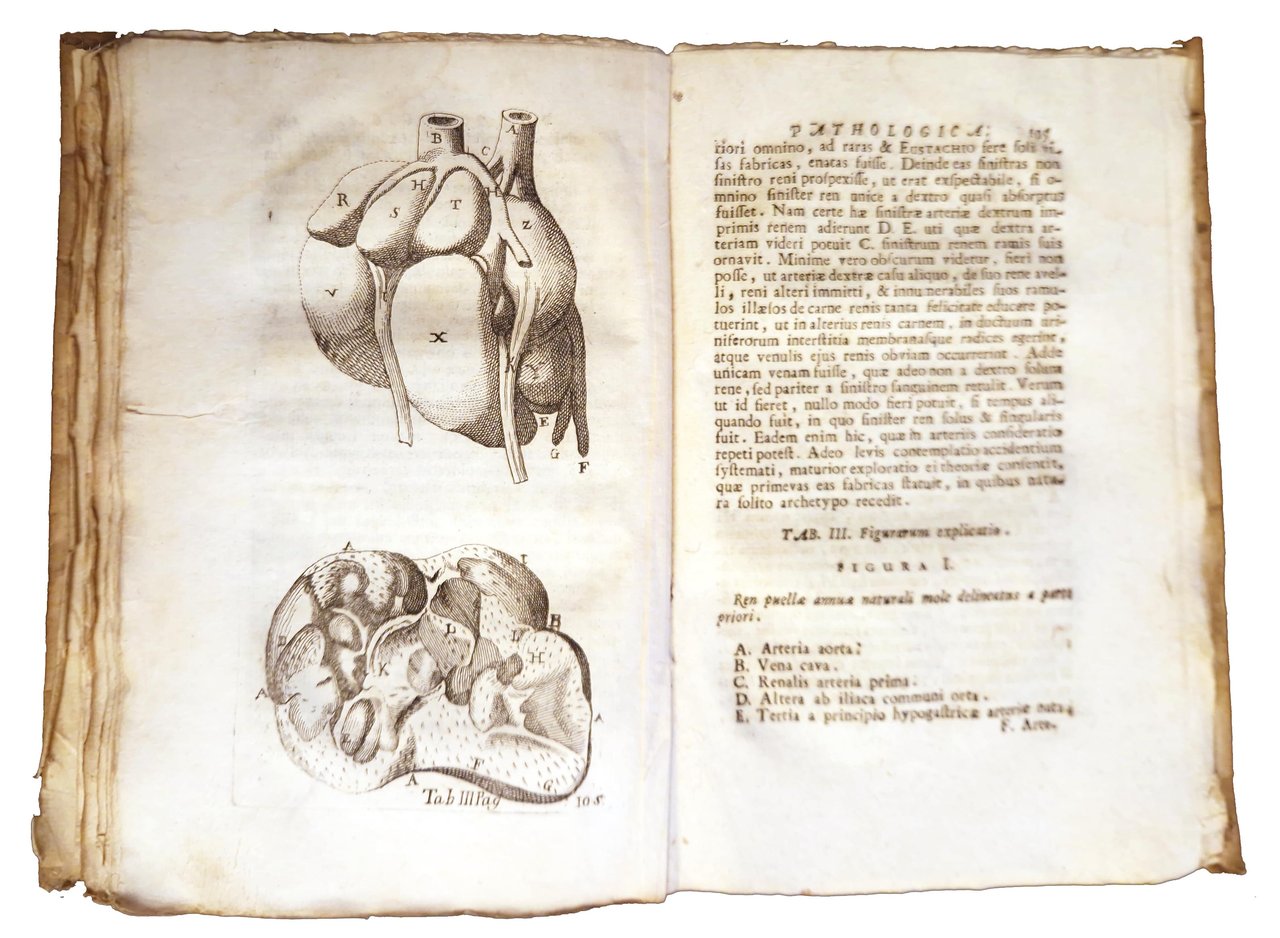 in-8°, 194x124 mm, leg. coeva in cartonato grezzo muto, con titolo su etichetta al dorso; pp. VIII, 224, [3] carte di tav. anatomiche, di cui due sono più volte ripiegate. Medaglia calcografica con ritratto dell'autore sul frontespizio. Iniziali, fregi e vignette xilografiche. Prima edizione veneziana, a cura del Remondini, di questo trattato di medicina patologica (precedentemente pubblicato a Losanna e a Napoli nel 1755), scritto dal medico e poeta svizzero Albrecht von Haller (1708-1777). L'opera comprende anche i testi "De respiratione experimenta anatomica, quibus aeris inter pulmonem et pleuram absentia demonstratur, et musculorum intercostalium internorum officium adseritur. Pars prima [-quarta]", che inziano, ciascuna con proprio occhietto, rispettivamente alle carte: H1r, I6r, L5r ed N3r, e il "Catalogus omnium operum Alberti de Haller", che inizia a carta O4v. Prov.: Grande etichetta di appartenenza incollata al contropiatto anteriore (Ex-libris E. Malan De Merindol) raffigurante un castello, con ai piedi lo stemma alle armi e il motto "Deus arx mea" della famiglia Malan de Merindol, sudafricana, il cui progenitore in Sudafrica fu un profugo francese ugonotto chiamato Jacques Malan, proveniente da Merindol (Provenza), che arrivò al Capo verso il 1689. Rif.: IT\ICCU\PUVE\004335. OCLC, 920149729. Riferimento: NUC pre-1956, v. 227, p. 595. Cond.: Tracce d'uso alla legatura (piccola mancanza di porzione del taglio inferiore anteriore della coperta). Carte pulite ed in barbe. Esemplare molto buono.