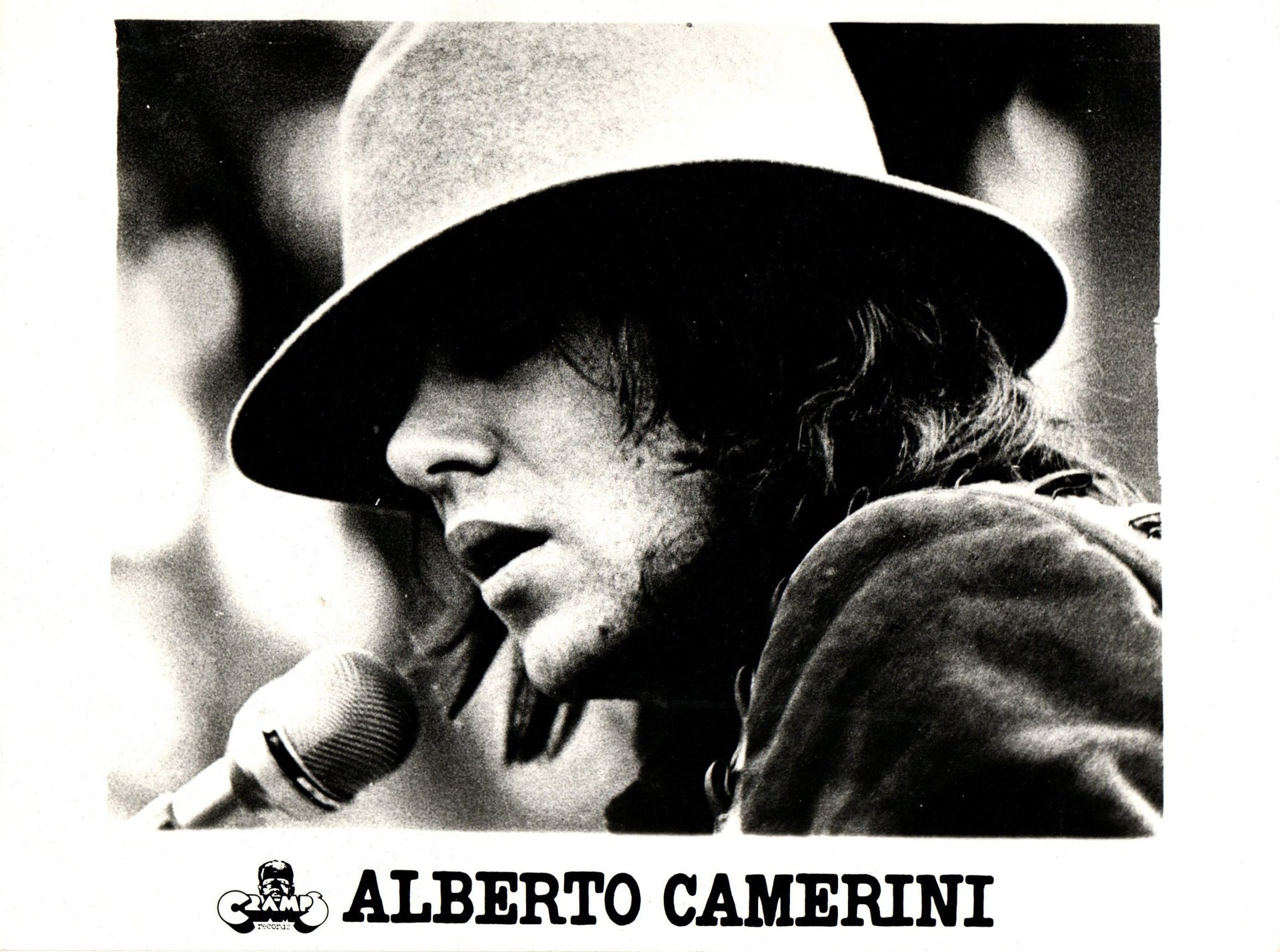Vintage print in b/n, foto promozionale della Cramps Records. Alberto Camerini vi collabora per la prima volta nel 1975 coproducendo Non gettate alcun oggetto dai finestrini, il primo album di Eugenio Finardi, e come solista dal 1976 al 1978.