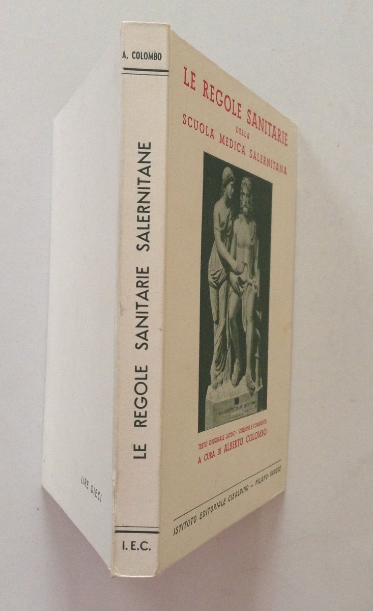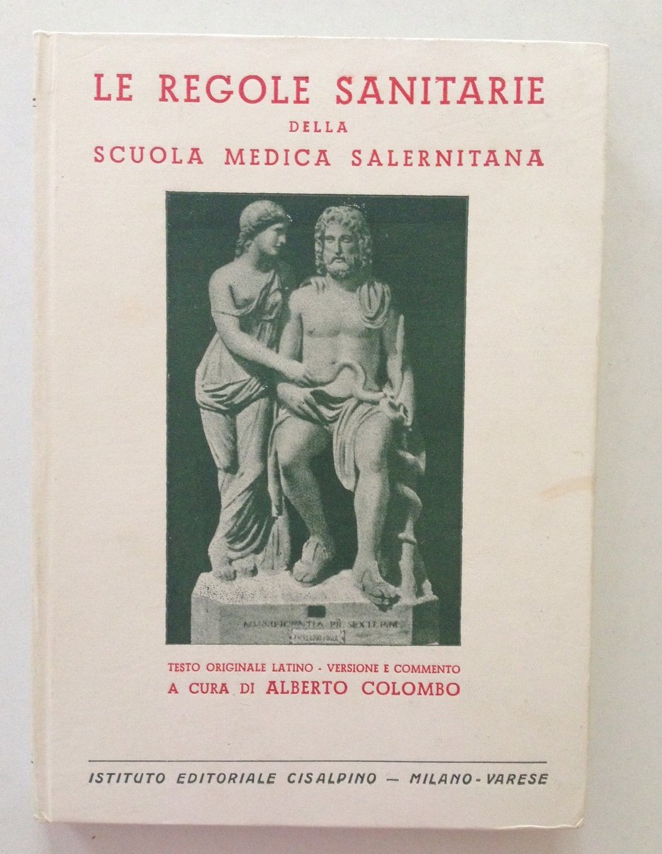 Alberto Colombo (a cura di), Le regole sanitarie della Scuola Medica Salernitana Istituto Editoriale Cisalpino-Milano-Varese 1939, cm 17.5x12.5, pp. 271, pecetto di collocazione in vecchia privata biblioteca in seconda di copertina, cartonato ed. ill. Condizioni di conservazione Esemplare in buone condizioni con leggere tracce d'uso. SETT105.L10092 MT