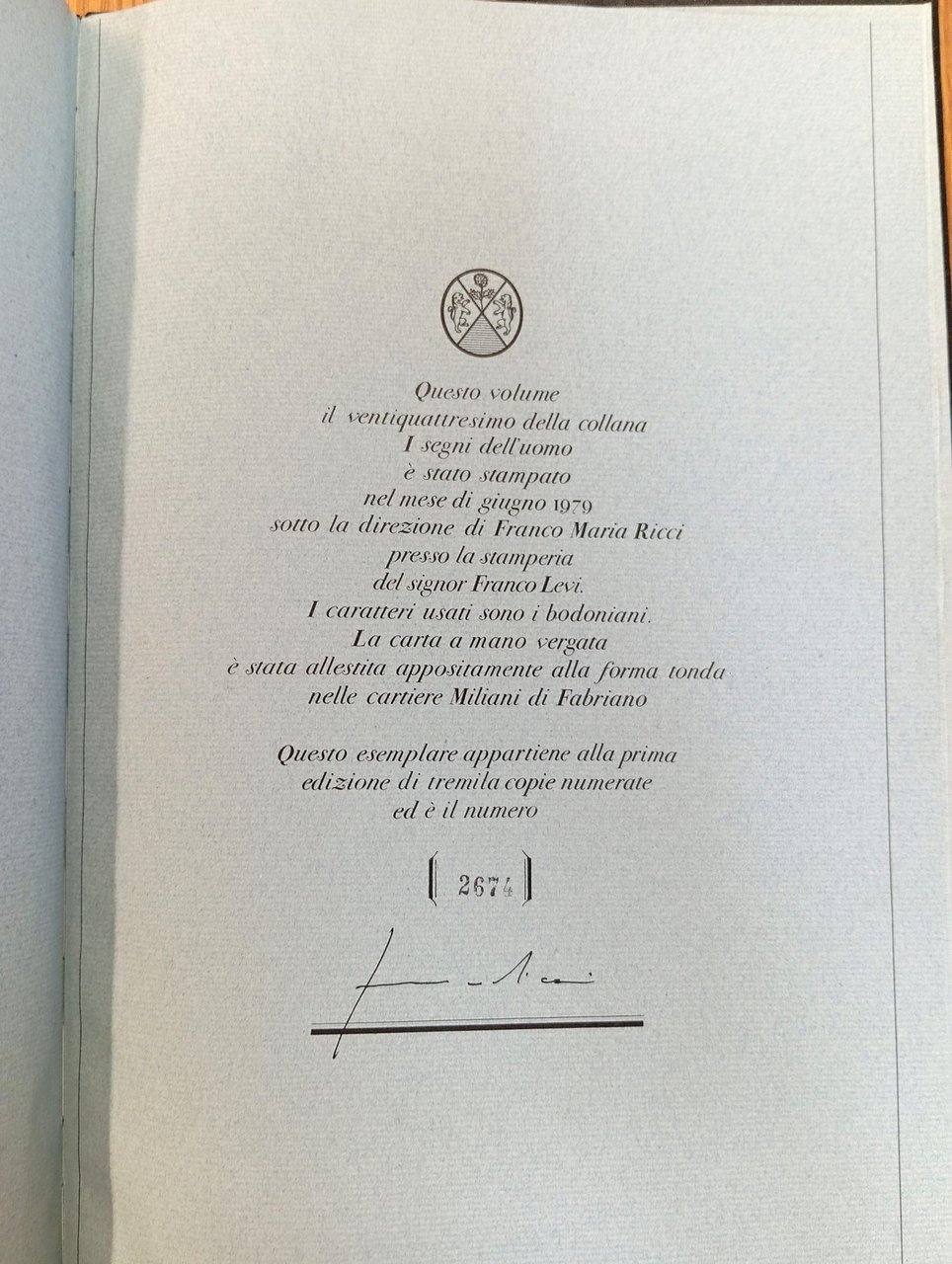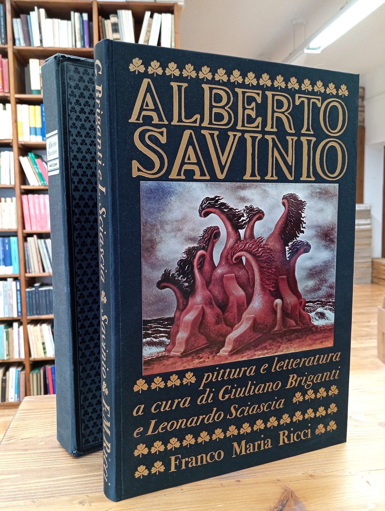 Prima edizione. Collana "I segni dell'uomo", 24. Tiratura di tremila copie numerate, la nostra è la n. 2674 con firma di autentica dell'editore Franco Maria Ricci - Volume rilegato in seta nera con immagine applicata al piatto, titolo e fregi in oro, custodia rigida editoriale, 165 pagine su carta vergata azzurra e splendidamente illustrate con tavole a colori applicate. Testi di Giuliano Briganti e Leonardo Sciascia, con una antologia di scritti di A. Savinio; in appendice, "Vita, opere, ricordi" di Corinna Ferrari. Solo qualche lieve usura ai margini del cofanetto, peraltro il volume risulta in condizioni davvero ottime.