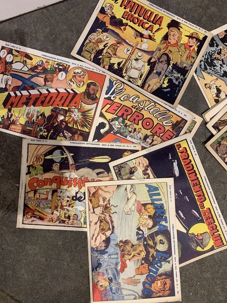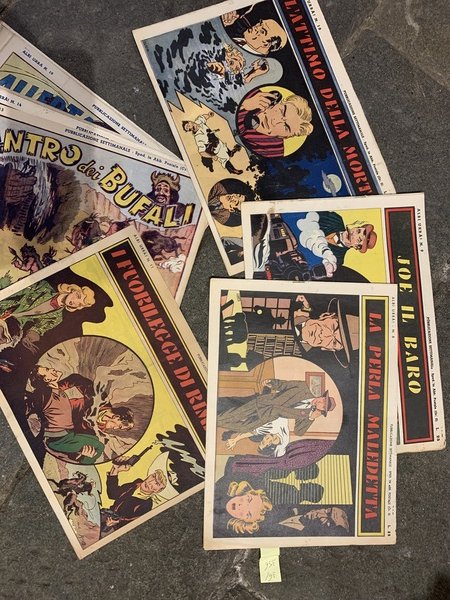 Fumetti cm. 32x24,5. Settimanale irregolare uscito in 34 numeri dal n. 1 febb. 1947 al n. 34 del 1 aprile 1948. Il lotto Ë composto da: n. 8 - La perla Maledetta; n. 9 - Joe il baro; n. 10 - L'attimo della morte; n. 11 - I Fuorilegge di Rimbok; n. 13 - L'antro dei bufali; n. 15 - Agguato al Forte Ellis; n. 16 - La sponda aurifera; n. 19 - Allerta a Venere; n. 21 - I conquistatori dell'atomo; n. 22 - La pattuglia eroica; n. 24 - Meteoria; n. 26 - Sonia la spia; n. 33 - Appuntamento alla boa; n. 34 - La freccia avvelenata. Ben tenuti.