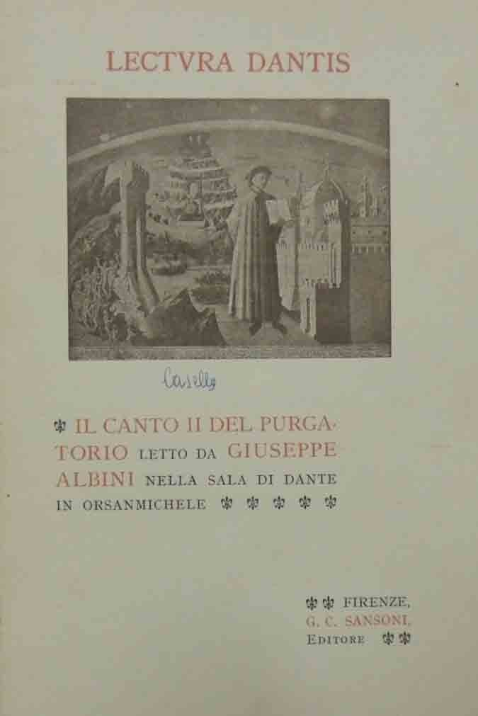Il Canto II del Purgatorio letto da Giuseppe Albini nella Sala di Dante in Orsanmichele, G. C. Sansoni Editore, Firenze 1933, pp. 36, ill. b.n., cm 24, br. ed. Collana Lectura Dantis. Testo della lettura effettuata nella Sala di Dante in Orsanmichele il 24 gennaio 1901. Leggere tracce d’uso alla brossura, una piccola annotazione a biro alla prima di copertina, lieve ingiallitura della carta, qualche sporadica sottolineatura a pastello, ma nel complesso esemplare in buono stato di conservazione.