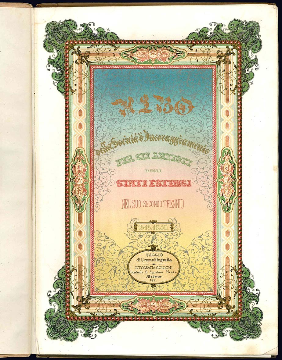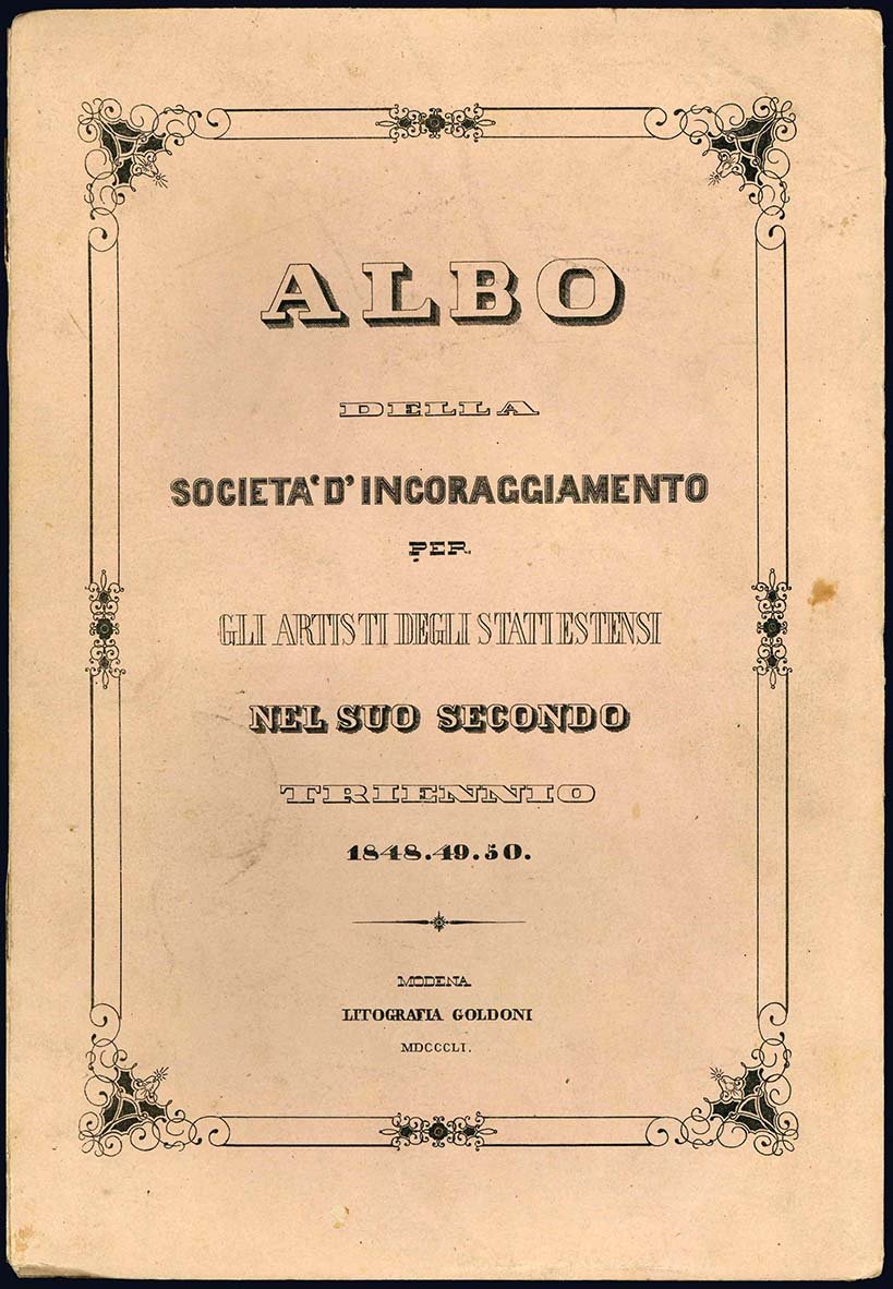 Albo della società d'incoraggiamento per gli artisti estensi nel suo secondo triennio 1848.49.50. Saggio di cromolitografia.