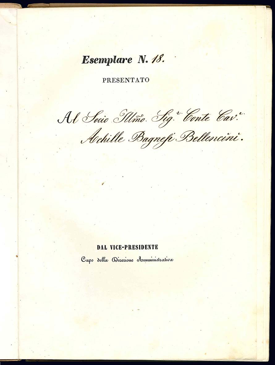 In folio piccolo (mm 319x221); pp. 46, (2), XVI tavole in litografia o al tratto a piena pagina. Frontespizio stampato in a più colori. Cartone stampato officinale. Secondo triennio 1848-49-50. Esemplare N. 18, con dedica manoscritta "al Socio Illmo. Sig. Conte Cav. Achille Bagnesi Bellencini". Prime carte staccate, dorso un po' sciupato e piccole tracce di sporco ai piatti, ma nel complesso ottima copia.
