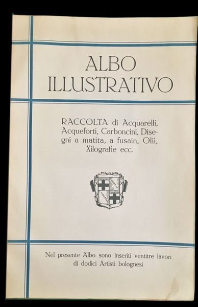 Albo Grafico e Illustrativo, Raccolta di Acquarelli, Acqueforti, Carboncini, Disegni a matita, a fusain, Olii, Xilografie ecc. Nel presente Albo sono inseriti ventitre lavori di dodici Artisti Bolognesi. Saggi di composizione e stampa eseguiti nella