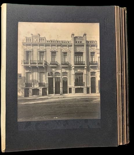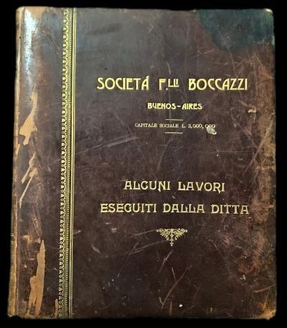 In 4° (30,4×25 cm); (10) cc. Bella legatura coeva editoriale in piena pelle con titolo e fregi in oro al piatto anteriore. Al piatto posteriore incisione a secco. Filetti e fregi in oro al dorso. Qualche strofinature e piccole mancanze agli angoli dei piatti. Ogni tavola presenta applicata una foto depoca scattata fra la fine dellottocento e linizio del novecento con immagini del padiglione della ditta Boccazzi, edifici, palazzi, strutture rurali, sistemi fognari, silos realizzati dalla ditta di costruzioni in cemebti-armati e compressi Fratelli Boccazzi di Buenos-Aires. La ditta prese parte, nella sezione Mostra degli italiani allEstero nel Palazzo dellAmerica Latina: Italiani al Cile ed Espositori Vari allEsposizone Internazionale di Torino del 1911. Alcune delle foto sono firmate dai fotografi, altre sono anonime ma sempre di alta qualità. Allinterno in buone-ottime condizioni di conservazione. Raro album.