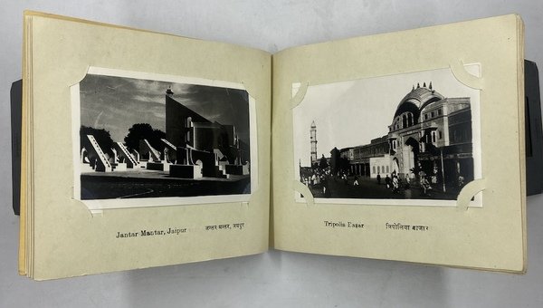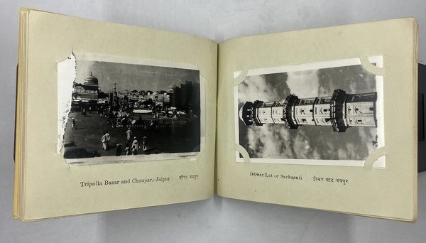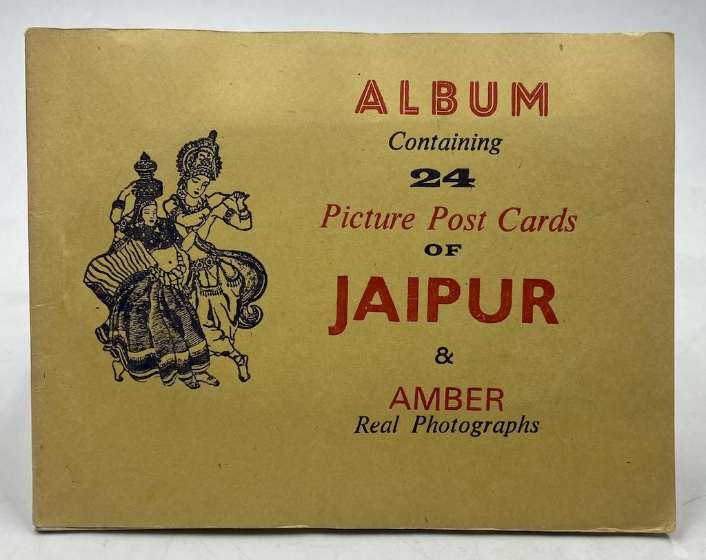 Album turistico cm 13x17, copertina con titoli in rosso e nero e illustrazione in nero, 12 pagine in cartoncino portanti 24 fotografie formato cm 10.5x7.5, con didascalie a stampa sul cartoncino di montaggio, in inglese e sanscrito. Le fotografie sono stampate piuttosto poveramente, con errori di sviluppo e difetti. Le immagini rappresntano diversi monumenti di Jaipur e Amber: Hawa Mahal Jaipur (2), Jaipur Museum, Nakkarkhnna Darwaza Jaipur, Chandra Mahal Jaipur, Chandra Mahal and Palace Jaipur, Mubarak Mahal Jaipur, Govin Devij’s Temple Jaipur, Jantar Mahal Jaipur, Tripolia Bazar Jaipur, Tripolia Bazar and Chaupar Jaipur (con difetto di stampa), Ishwar Lat or Sarkasuli Jaipur, City Gate Jaipur, Galta Jaipur, Gantor Jaipur, Ganesh Pol Amber, Amber Fort & Palaces, Dirwan-Am Amber, Interior Diwan-I-Khas or Hai Mandir Amber, Hai Mahal Jaipur, Sanganer Jain Temple Jaipur, Jagat Shromani Temple Jaipur, Elephant Ride Jaipur.