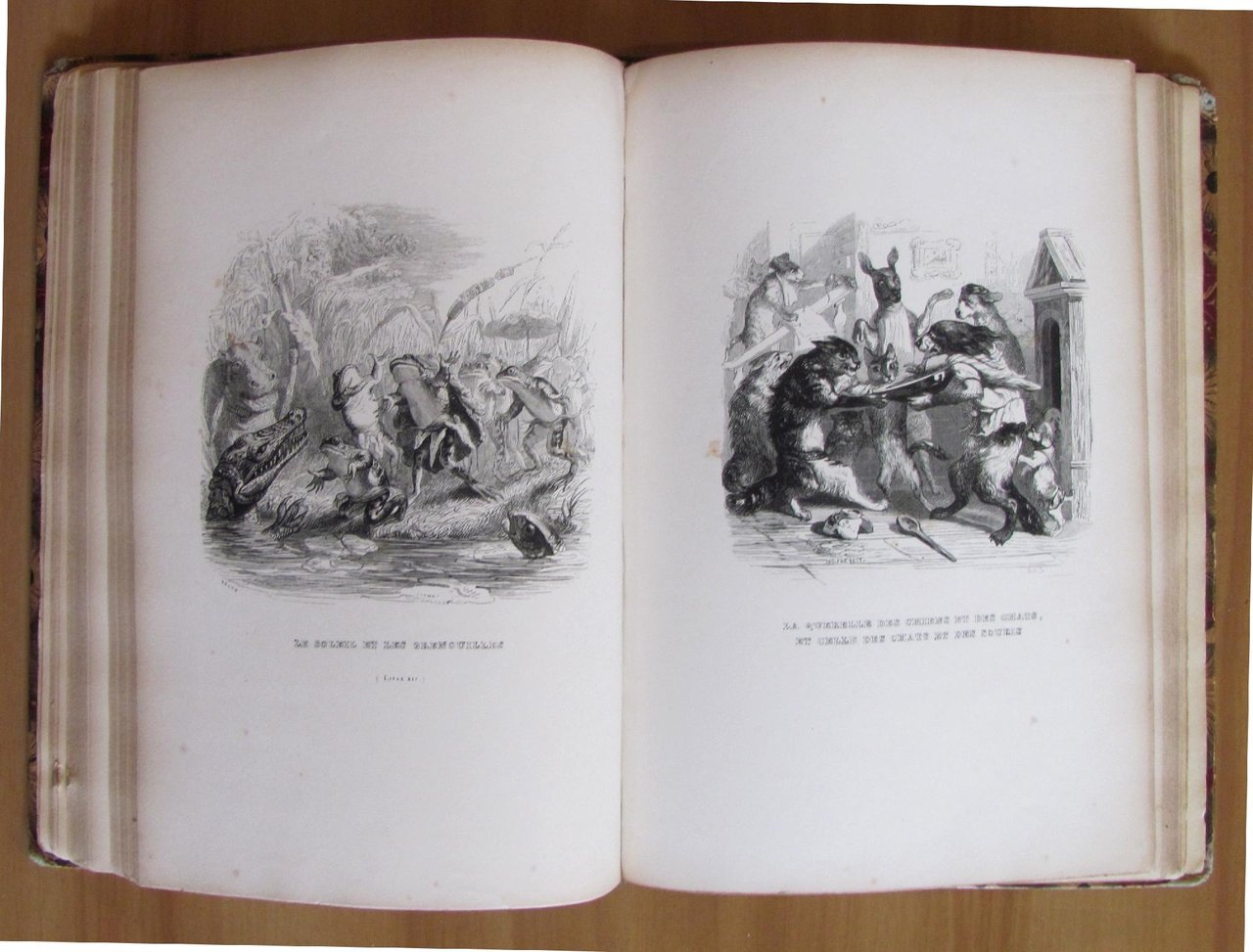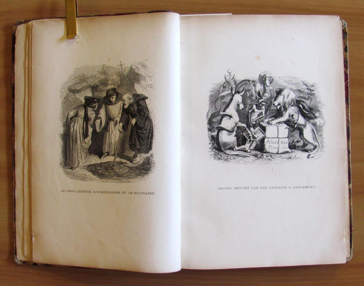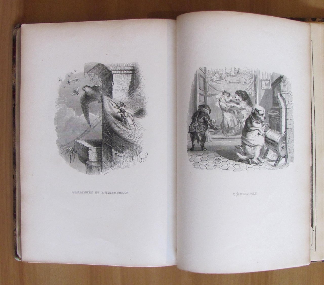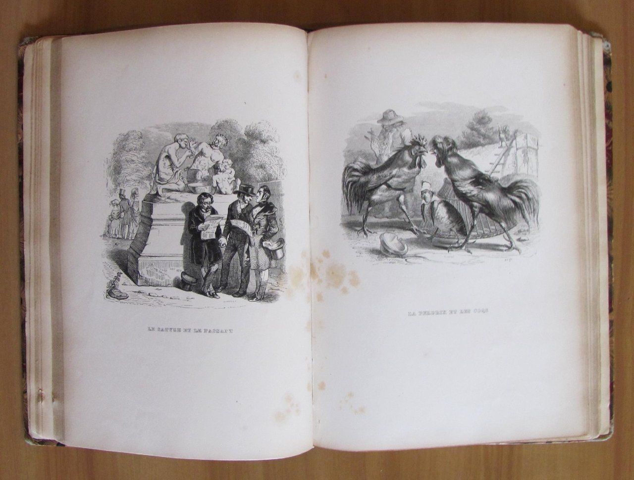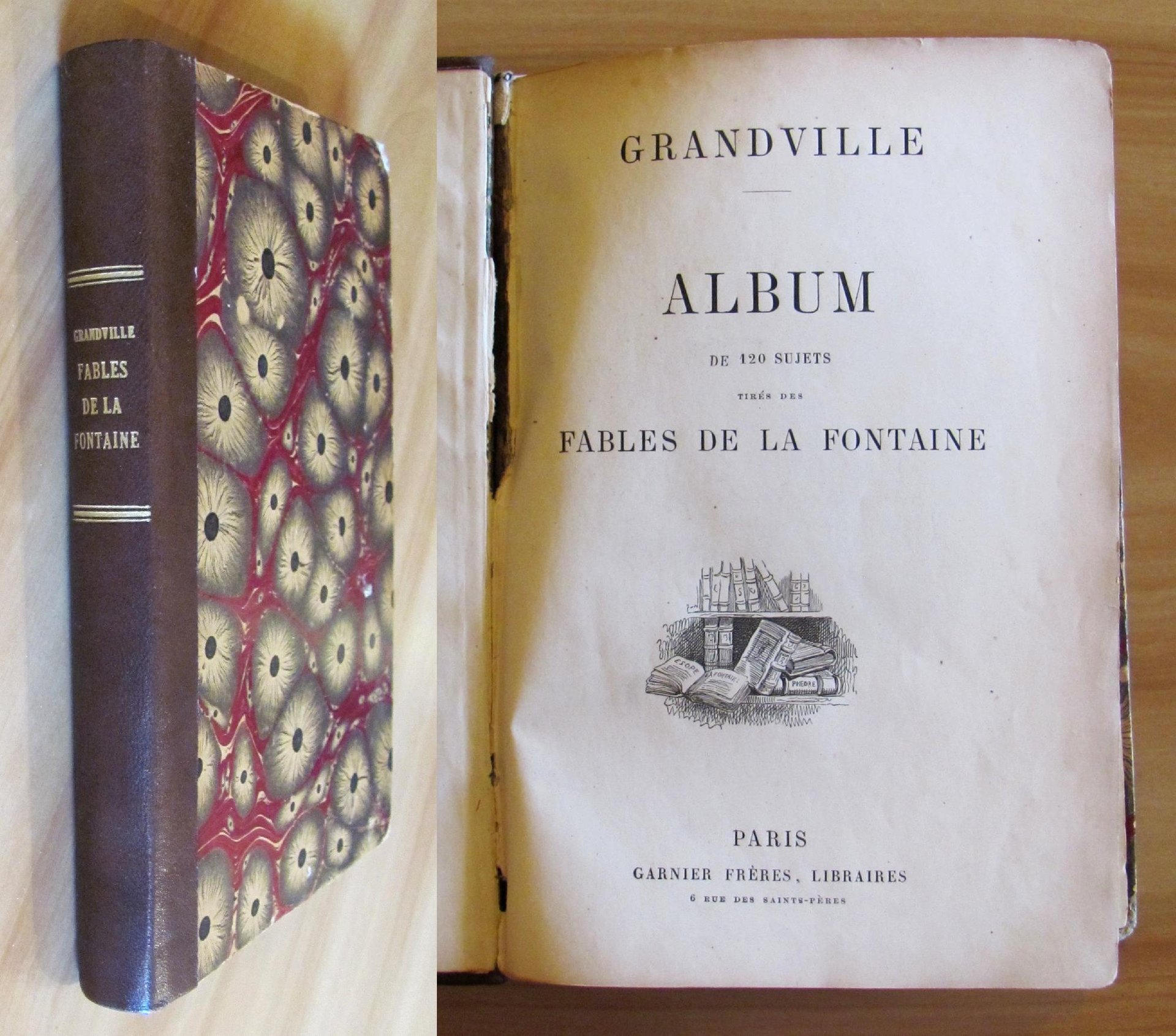 Libro di sole tavole f.t., con titolo sottostante, di Grandville. Libr. Garnier Frères - Paris, s.d. ma fine '800. Bella rilegatura con dorso in pelle con titoli in oro. Ex-Libris in 2^ di copertina. Lieve distacco della metà superiore della sola cerniera anteriore ma libro perfettamente legato e solido. Sporadiche fioriture del tempo in qualche pagina ma freschissimo. 16,5x24; pagine 120 di tavole + 32 di Catalogo editoriale. Molto Raro e in Buonissimo stato. , Molto buono (Very Good)