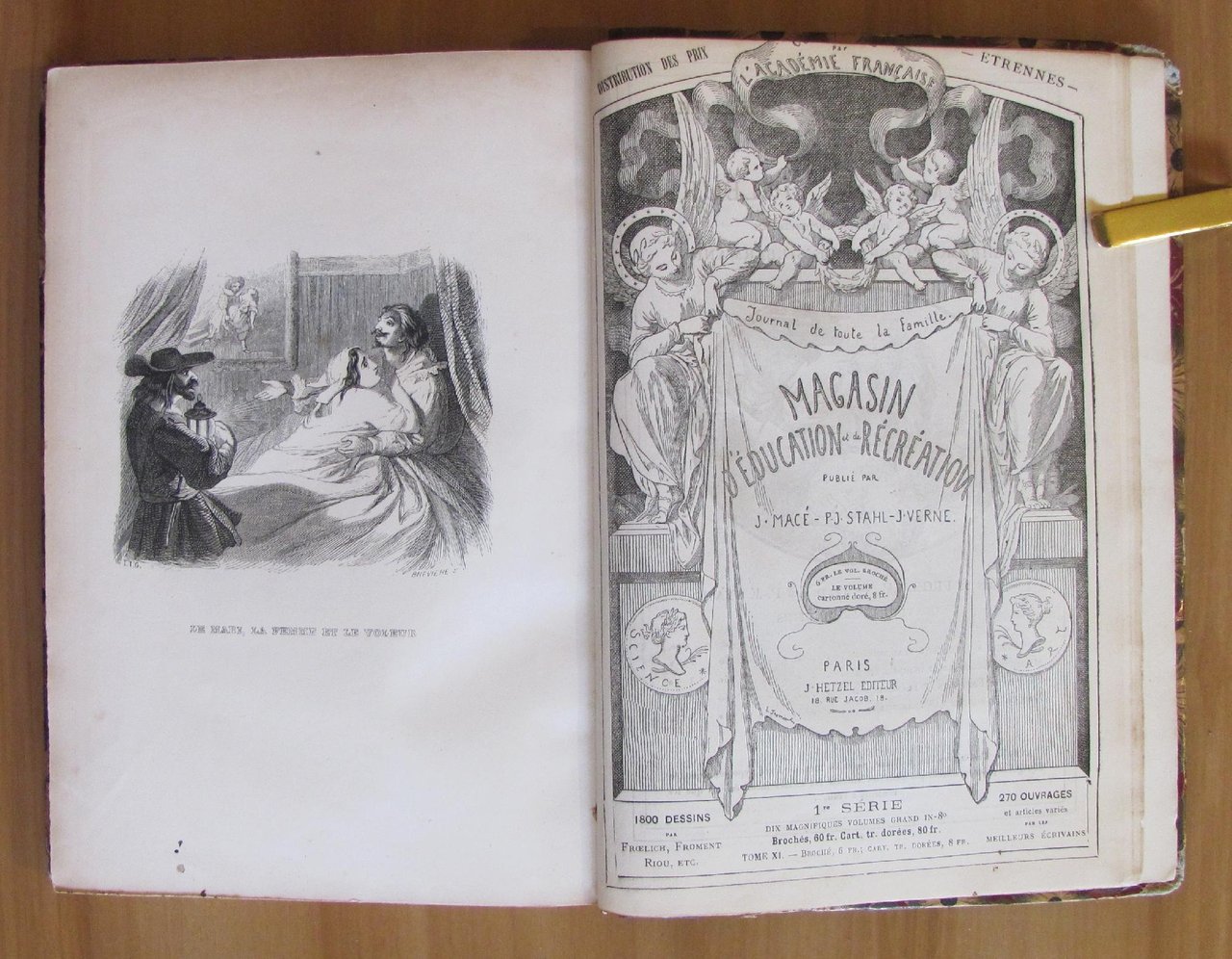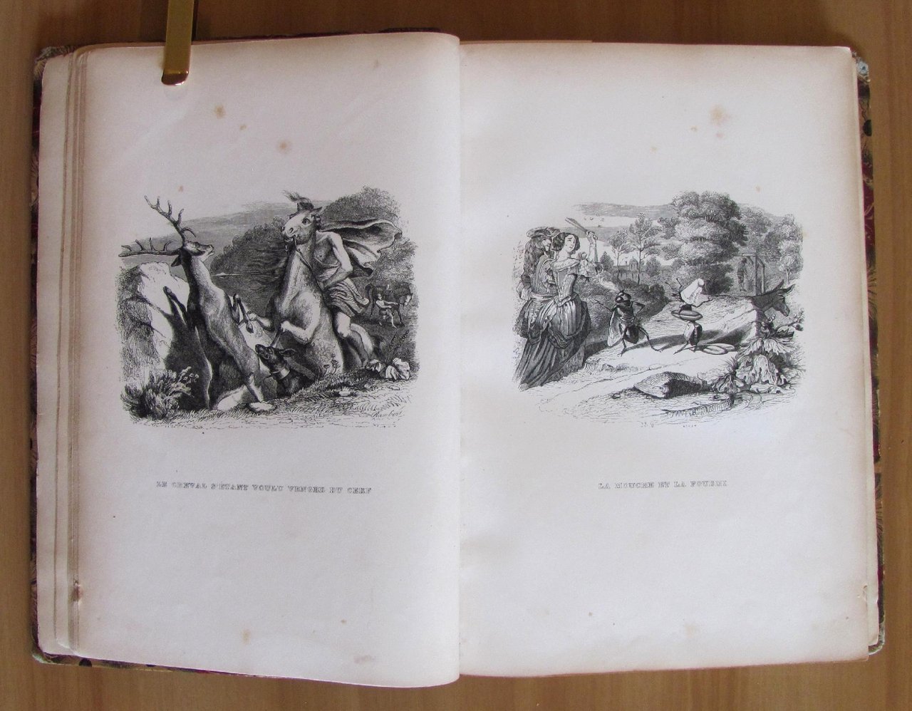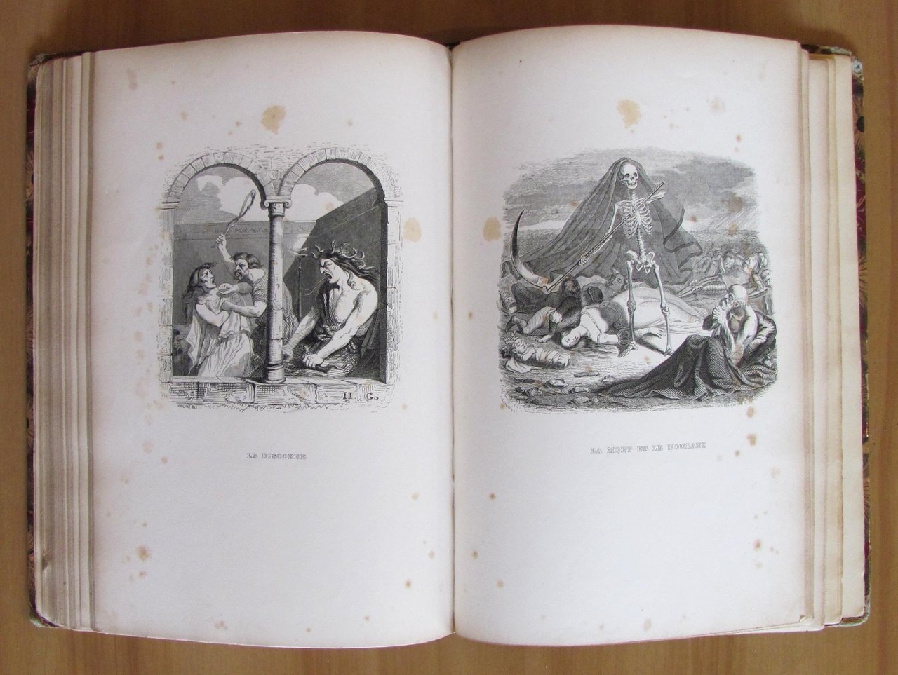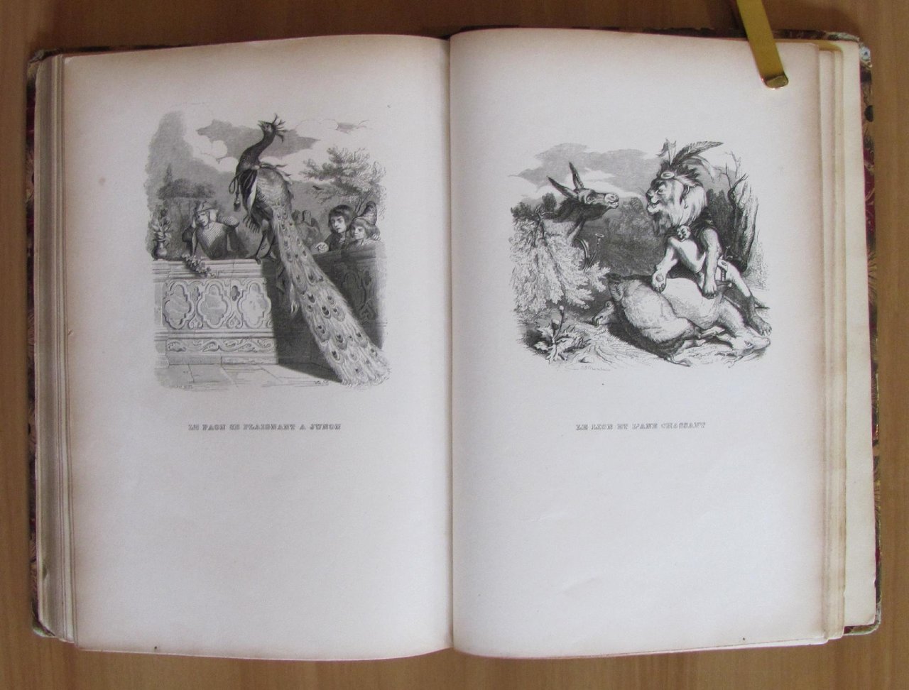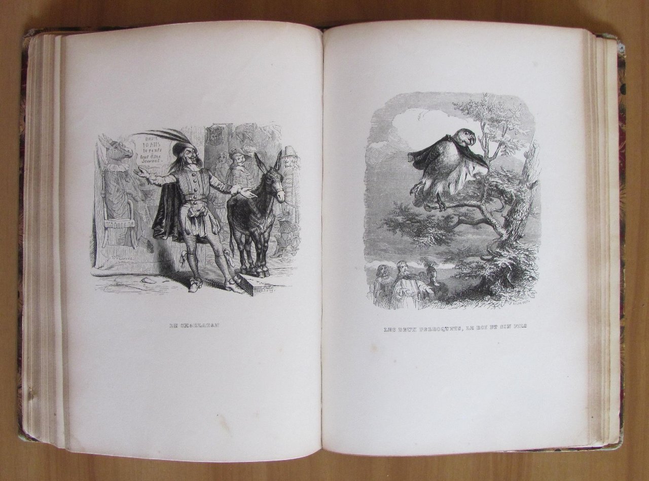 Libro di sole tavole f.t., con titolo sottostante, di Grandville. Libr. Garnier Frères - Paris, s.d. ma fine '800. Bella rilegatura con dorso in pelle con titoli in oro. Ex-Libris in 2^ di copertina. Lieve distacco della metà superiore della sola cerniera anteriore ma libro perfettamente legato e solido. Sporadiche fioriture del tempo in qualche pagina ma freschissimo. 16,5x24; pagine 120 di tavole + 32 di Catalogo editoriale. Molto Raro e in Buonissimo stato. , Molto buono (Very Good)