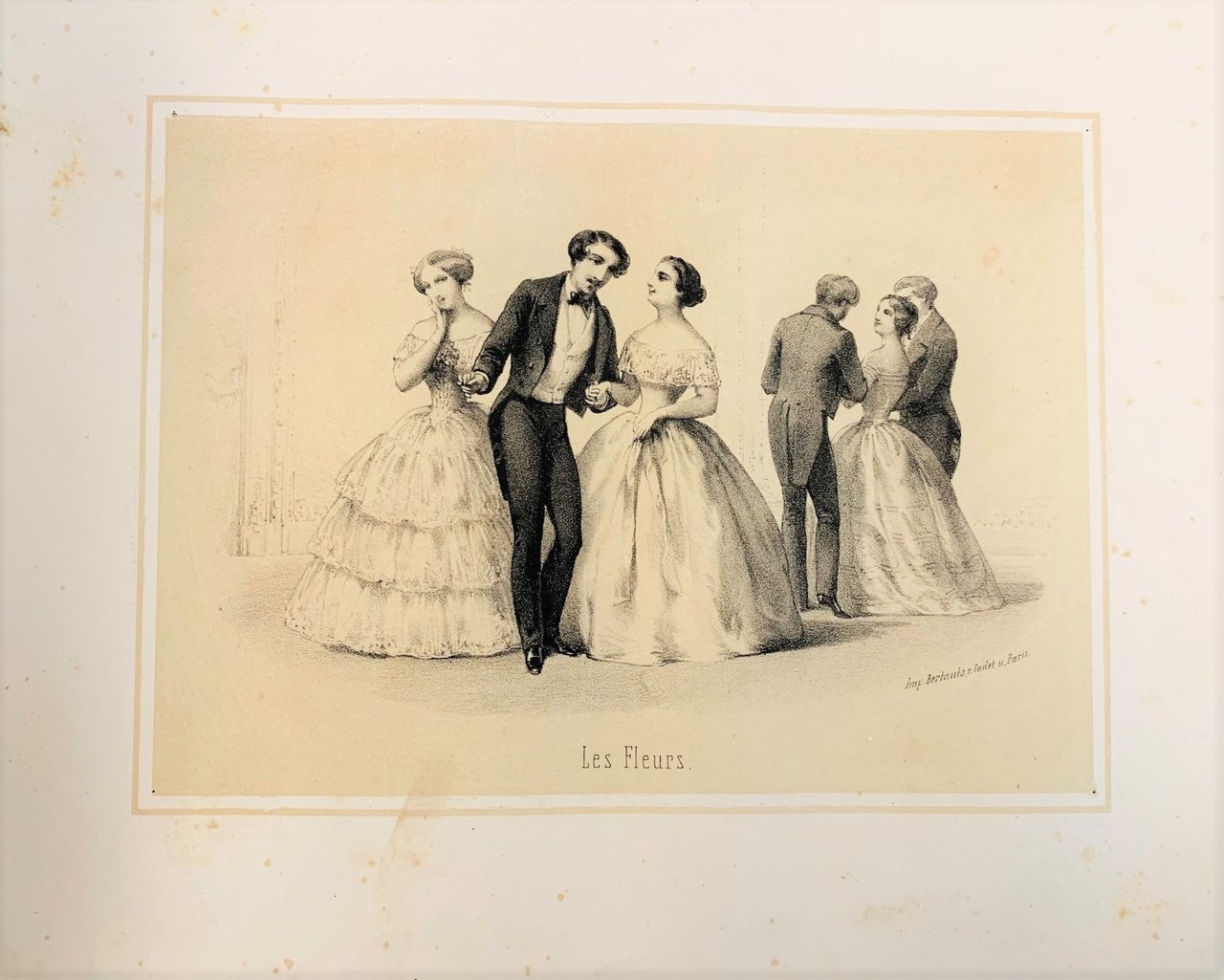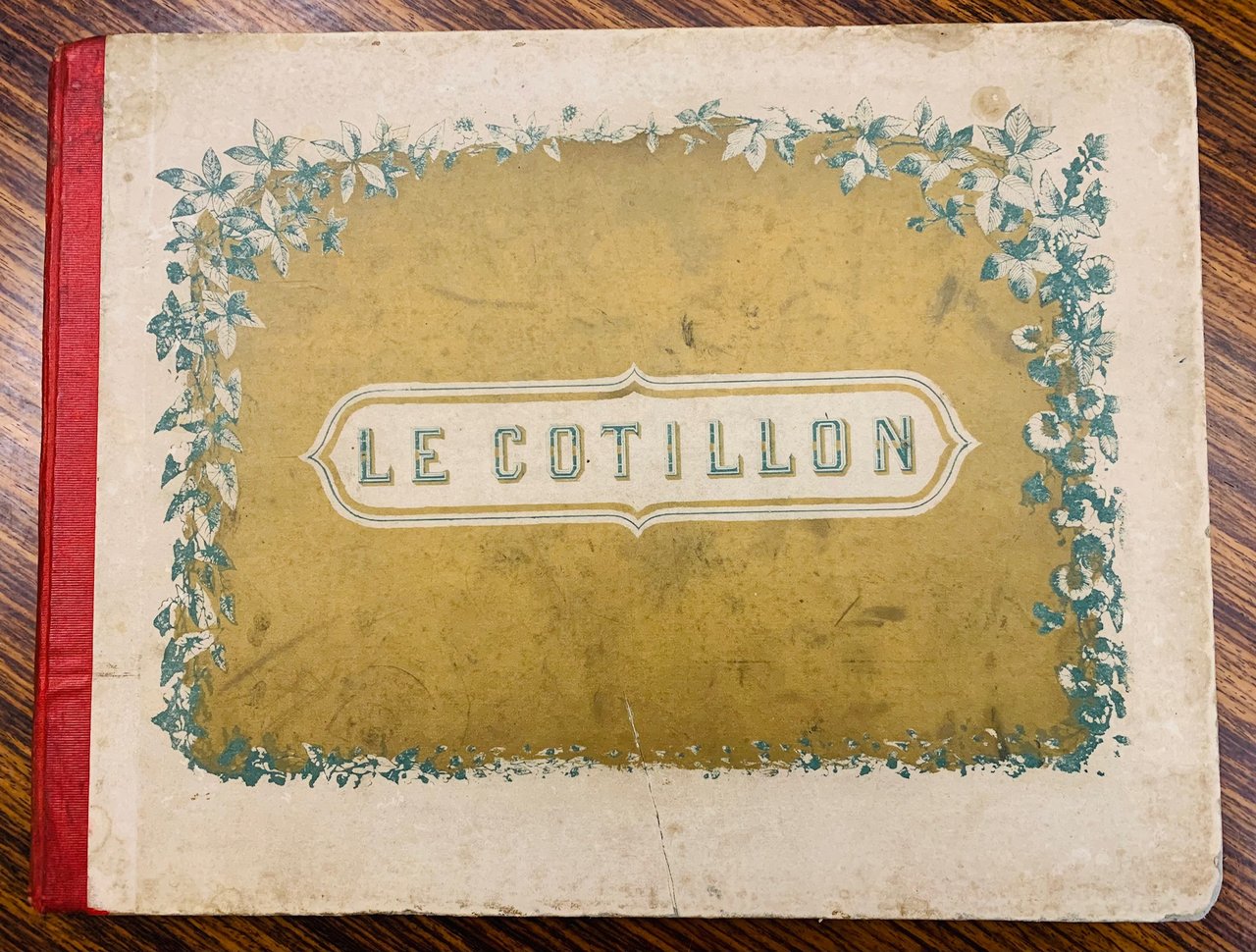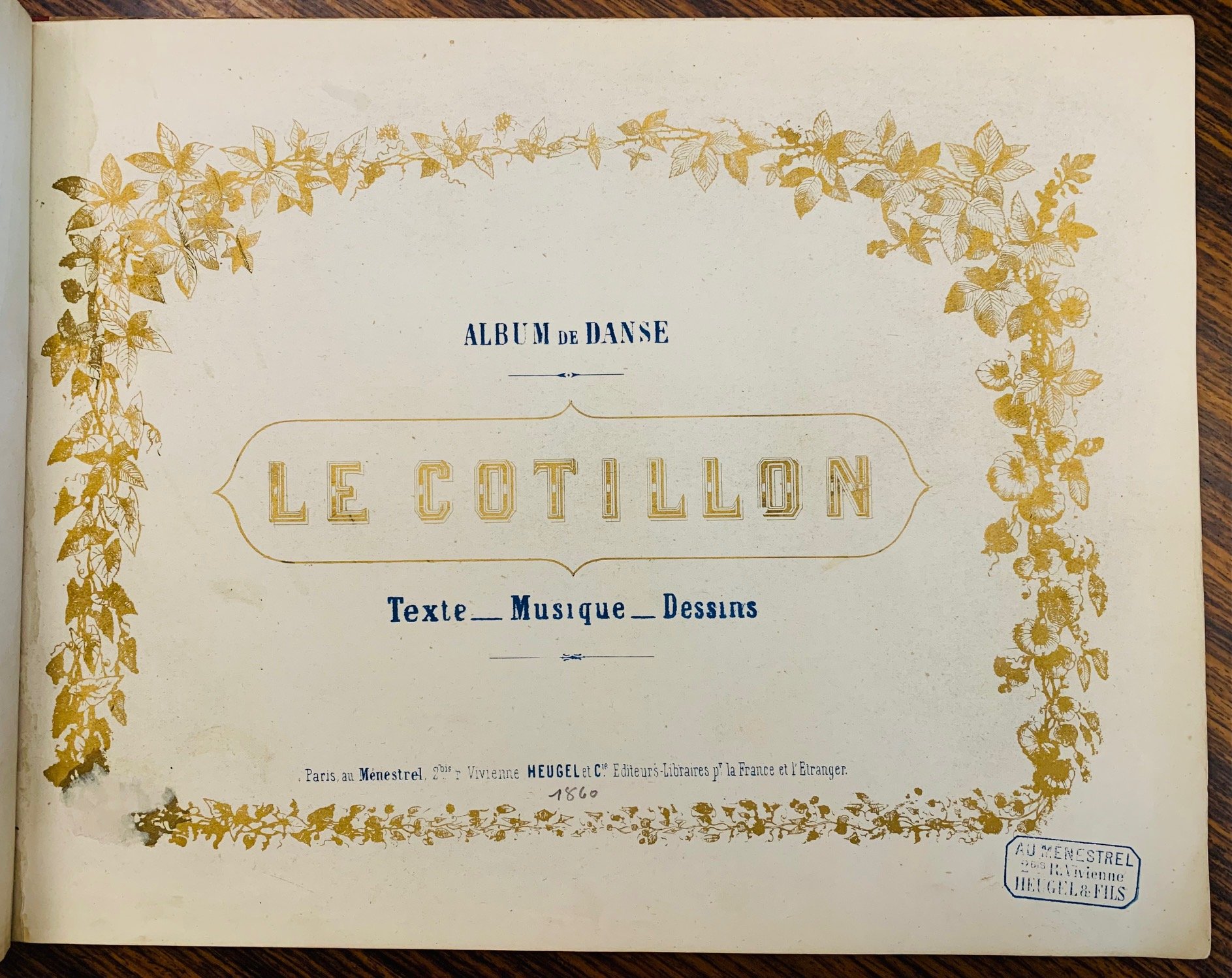 >Album in-4 oblungo (mm. 235x310) titolo, pp (4), 19 (1 b), 14 tavole eseguite in litografia raffiguranti balletti, 7pp di spartito musicale per pianoforte "Air du cotillon", testo in lingua francese. Legatura in cartonato editoriale, al piatto superiore titolo entro cornice oro. Fioriture nei margini bianchi delle tavole, timbro dell'editore nel margine inferiore del foglio di titolo.