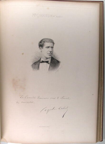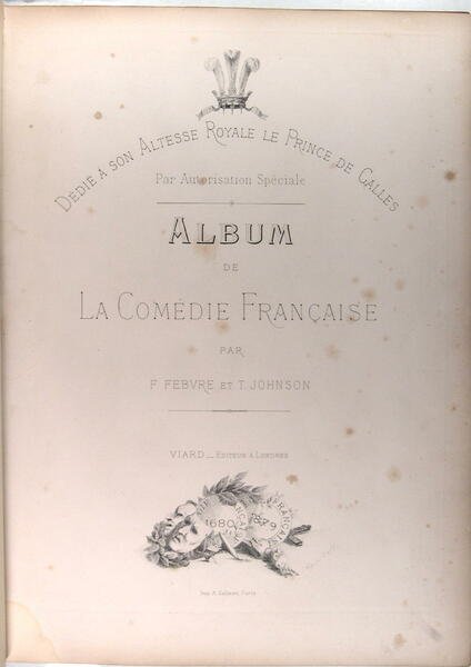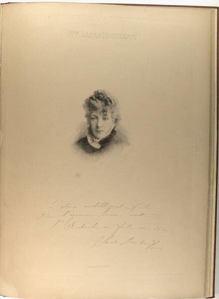 Viard éditeur, Londres, 1879, in folio, reluire pleine toile bordeaux postérieure, pièce de titre. Album dédié à son Altesse Royale le Prince de Galles, par autorisation Spéciale, 1680-1879. Texte en anglais et en français. XXXVII pages ; 56 pages. 1 frontispice et 21 portraits. Coquelin cadet, Sarah Bernhardt, Emilie Broisat, .