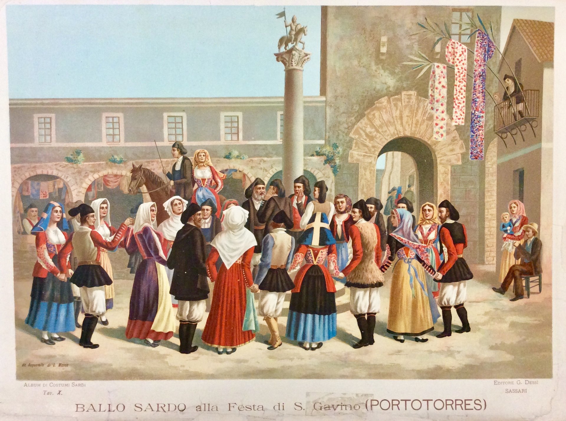 In folio (mm. 485x332), cartella editoriale in piena tela blu con titoli e grande figura impressa in oro al piatto, contenente una bellissima raccolta di 10 tavole litografate a colori che raffigurano costumi di gala e festivi di: Osilo, Quarto Sant'Elena, Desulo e Aritzo, Fonni, Iglesias, Sennori, Atzara, Ploaghe, Cabras e Portotorres (illustrato da una scena di ballo sardo alla Festa di S. Gavino). La raccolta, che costituisce la prima serie di costumi sardi, è contenuta in 10 dispense a fogli sciolti (conservate le belle bross. a colori disegnate da Clemente Gavino), per complessive pp. 120, con numerose figure nel testo."Prima edizione". Cfr. Ciasca,I,4721.Esemplare con lievi mancanze marginali (alle tavole) e alc. lievi fioriture, ma complessivamente ben conservato.