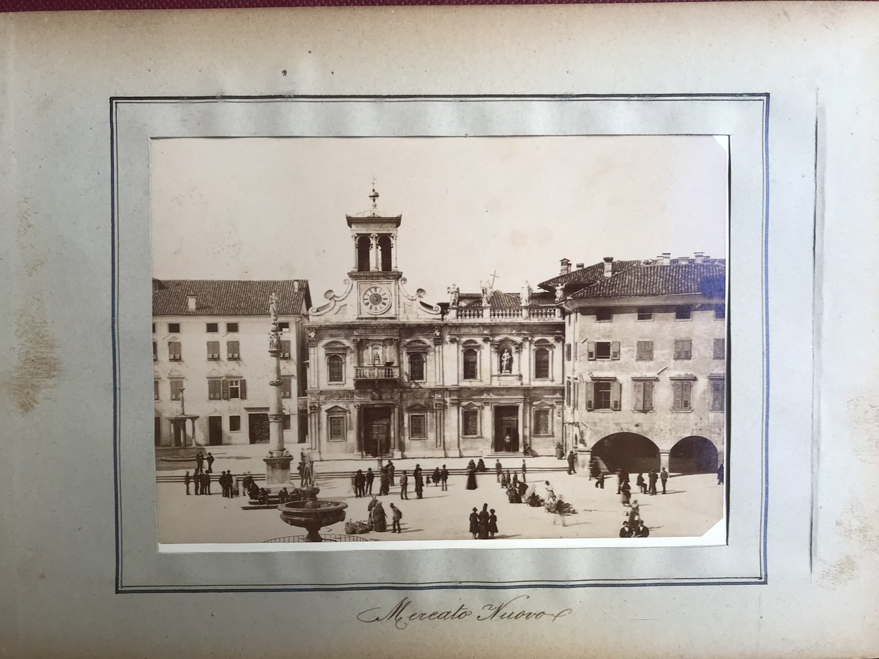 Bell'album in 8° oblungo, contenente 20 foto raffiguranti principali luoghi della città di Udine, con la stazione ferroviaria, il mercato Nuovo, panorama di Gemona, 3 foto della ferrovia Pontebbana, il ponte Internazionale fra Pontebba e Pontafel, Ponte del diavolo a Cividale, Ponte sul Natisone e Premariacco, Porta di Palmanova e porto Nogaro. Le foto sono custodite all'interno di un album in piena pelle dell'epoca con al piatto superiore le iniziali 'C' e 'D' incise in oro e fermaglio funzionante. Lievi spellature ma nel complesso buono stato di conservazione.