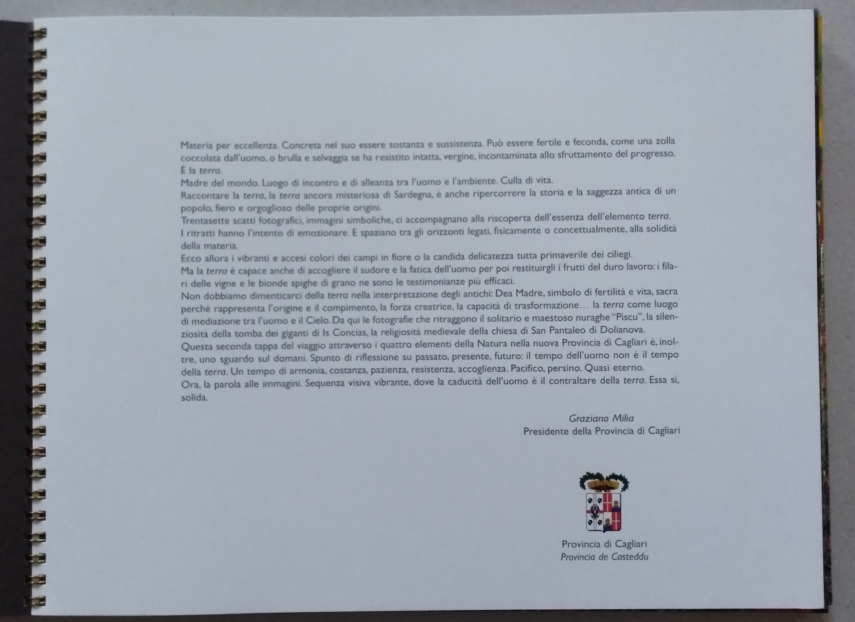 Album Fotografico, Terra Sardegna Provincia di Cagliari, 2007; cm. 24x32, pp. nn (pp 3 di testo); con 37 tavv. a col. a p.pag. con il testo a fronte in italiano, sardo, inglese, giapponese, arabo; legatura spiralata; ed. numerata di 750 es. Condizioni di conservazione Esemplare in buono stato con leggere tracce d'uso; brossura editoriale con leggerissime abrasioni. SETT144.L14310 MT