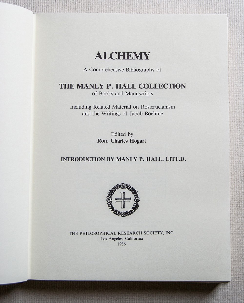 XVIII, 314 pp. con ill.n.t. e 8 tavv. a col.f.t. Tiratura di 1000 copie. Ampie descrizioni biografiche e bibliografiche di 164 libri e 245 manoscritti della Biblioteca PRS. Comprendono materiale correlato sul rosacrocianesimo e sugli scritti di Jacob Boehme, così come i manoscritti Bacstrom in diciotto volumi con traduzioni in inglese dei primi libri alchemici, un volume di manoscritti della biblioteca del Conte Cagliostro, il manoscritto triangolare su pergamena del conte di St. Germain, una parte di Ripley's Scroll a colori, l'edizione William Law di Jacob Boehme con tavole attribuite a Rubens o altro ancora.