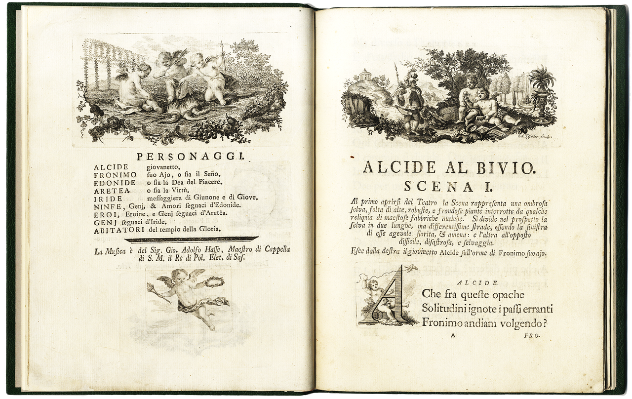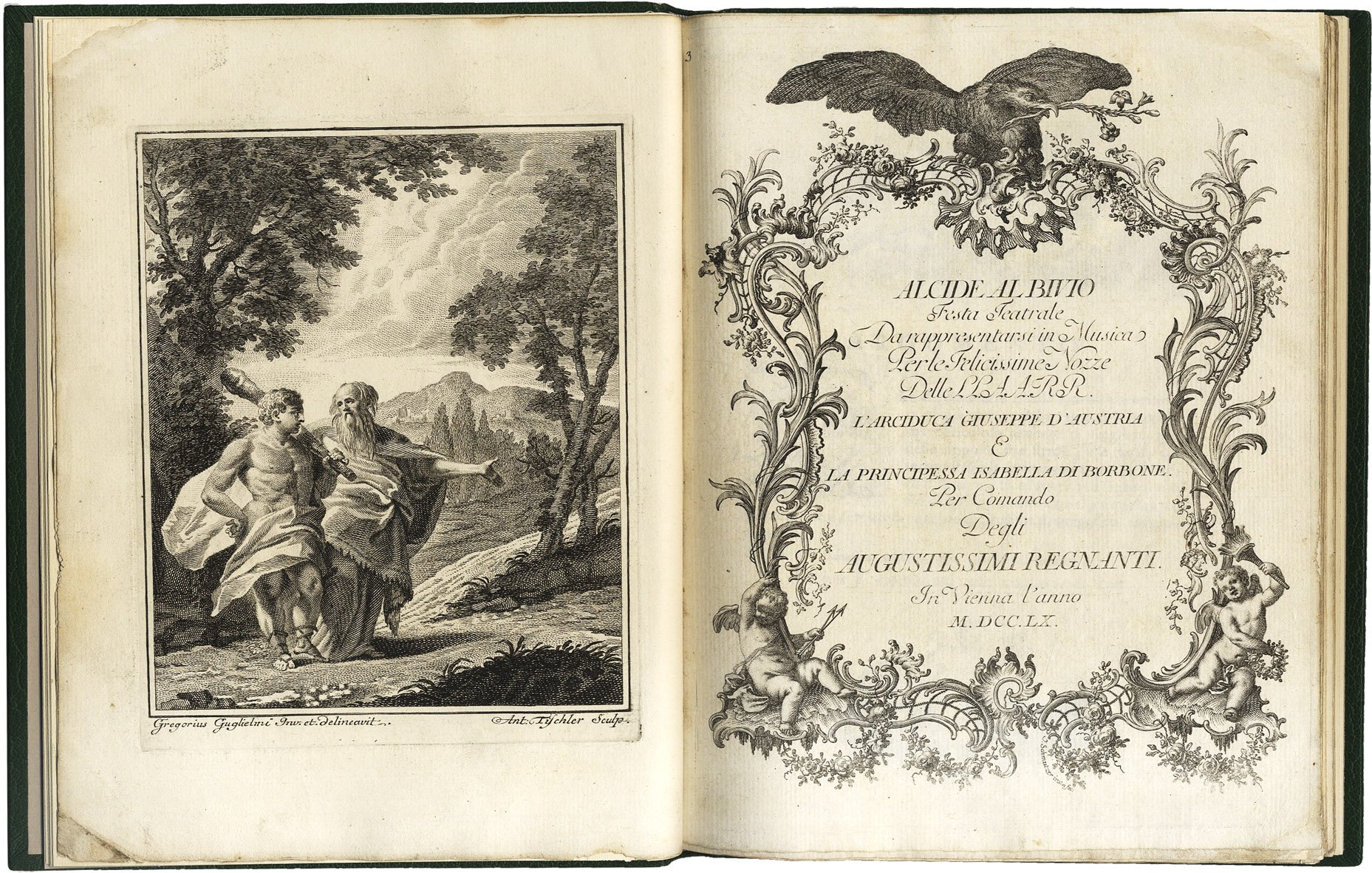 >in-4 (mm.245x190), 32 ff. n.n. Antiporta e titolo figurati incisi a piena pagina, nel testo vi sono 21 grandi testate, finali di pagina e lettere iniziali, figurate incise, tutte splendide incisioni in rame di Ant. Tischler. Legatura moderna d'amatore in pieno marocchino verde scuro, doppio filetto ai bordi dei piatti, dorso a nervi con titolo e fregi floreali in oro, tagli dor. Edizione originale di questa rara composizione poetica di Metastasio scritta in occasione delle nozze dell'9 Ottobre 1760 celebrate in Vienna tra Giuseppe d'Austria e Isabella di Borbone. Il libretto venne musicato da Adolf Hasse. Bellissime le illustrazioni di Tischler. Esemplare in carta forte, a pieni margini, accuratamente rinfrescato. Sonneck, Cat. Opera Librettos, I, p.453- Salvioli, I, pp.110-111. Wurzbach, XVIII, 13.