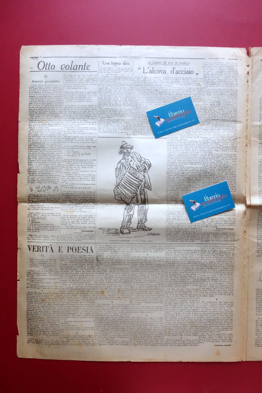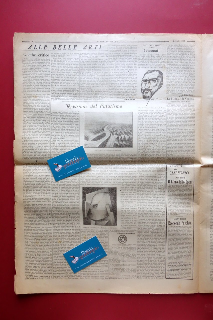 Giornale settimanale, L'Alcova di Acciaio" articolo di Francesco Flora e "Revisione del Futurismo" articolo di Vincenzo Costantini; corredato da due illustrazioni in bianco e nero raffiguranti le opere "velocità di motoscafo" di Benedetta e "Mussolini architettonico" di Enrico Prampolini in "la Fiera Letteraria" giornale settimanale di lettere, scienze e arti anno III - numero 49 Roma, 4 dicembre 1927 Roma 1927; cm 58,5x42,5; pp. 8 con qualche ill. in b/n (vedi foto); esemplare a fogli sciolti. Numero completo. Condizioni di conservazione Condizioni complessivamente buone con tracce d'uso, pieghe di conservazione, leggero per lo più marginale ingiallimento dovuto all'età e al tipo di carta, alcune piccole bruniture. Marginali strappetti per lo più di piccole dimensioni e prevalentemente concentrati al margine destro delle pagine 5-6 (vedi foto). Il primo articolo, a pagina 2, consiste in una recensione critica della pubblicazione di Marinetti. Il secondo è riassumibile come una disamina critica dell'arte futurista e di alcuni dei suoi maggiori interpreti. Completo. SC03.D18478 N F "