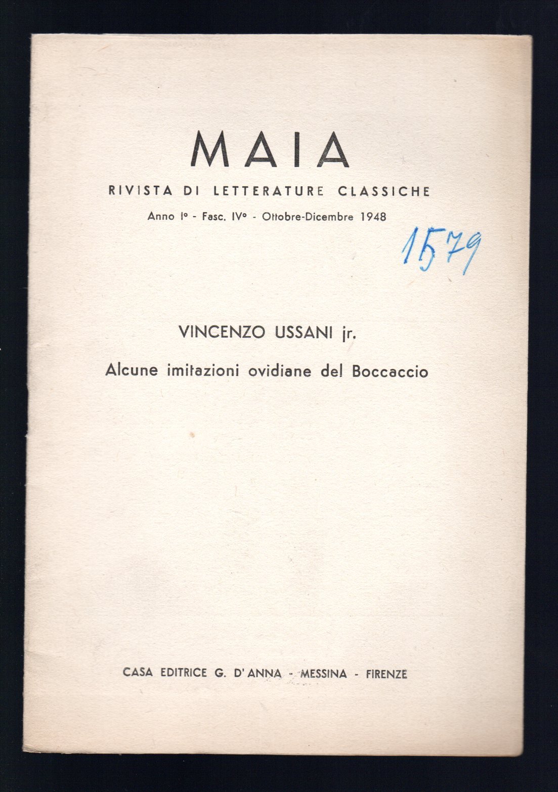 Opuscolo vintage. Maia, Rivista di letterature classiche anno I fasc. IV - Ottobre - Dicembre 1948. Segni di biro in copertina. Usura da scaffale. Ordinario segno del tempo.