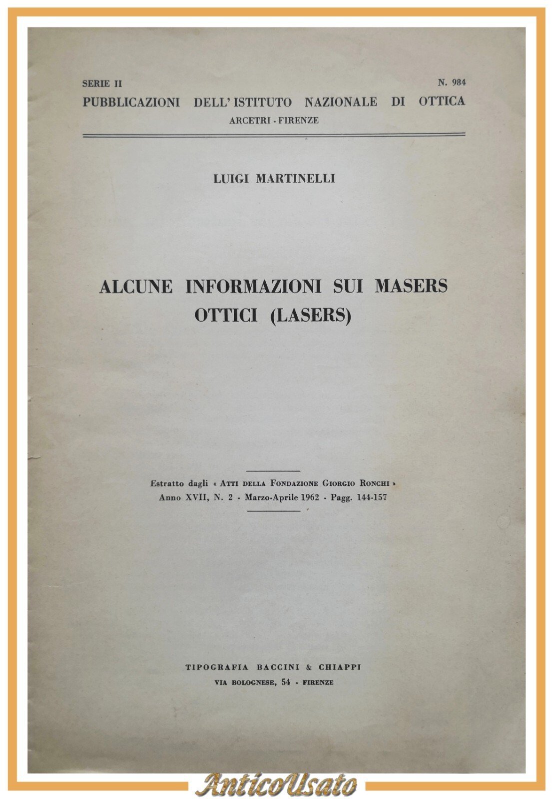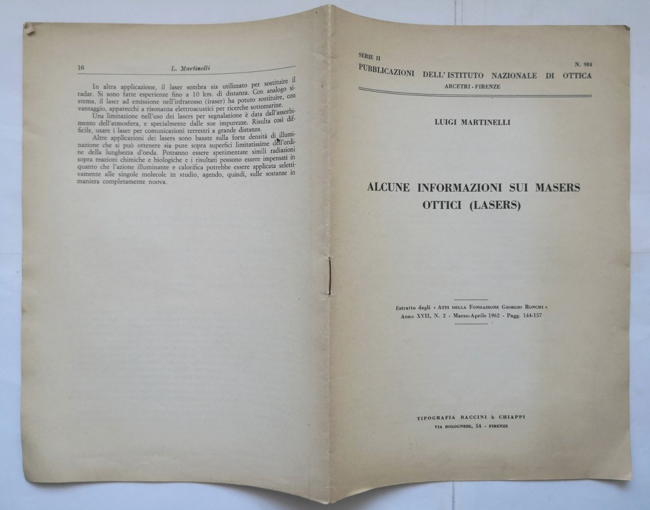 ALCUNE INFORMAZIONI SUI MASERS OTTICI LASERS di Luigi Martinelli. Estratto dagli "Atti della Fondazione Giorgio Ronchi" Anno XVII, Numero 2 - marzo-aprile 1962.