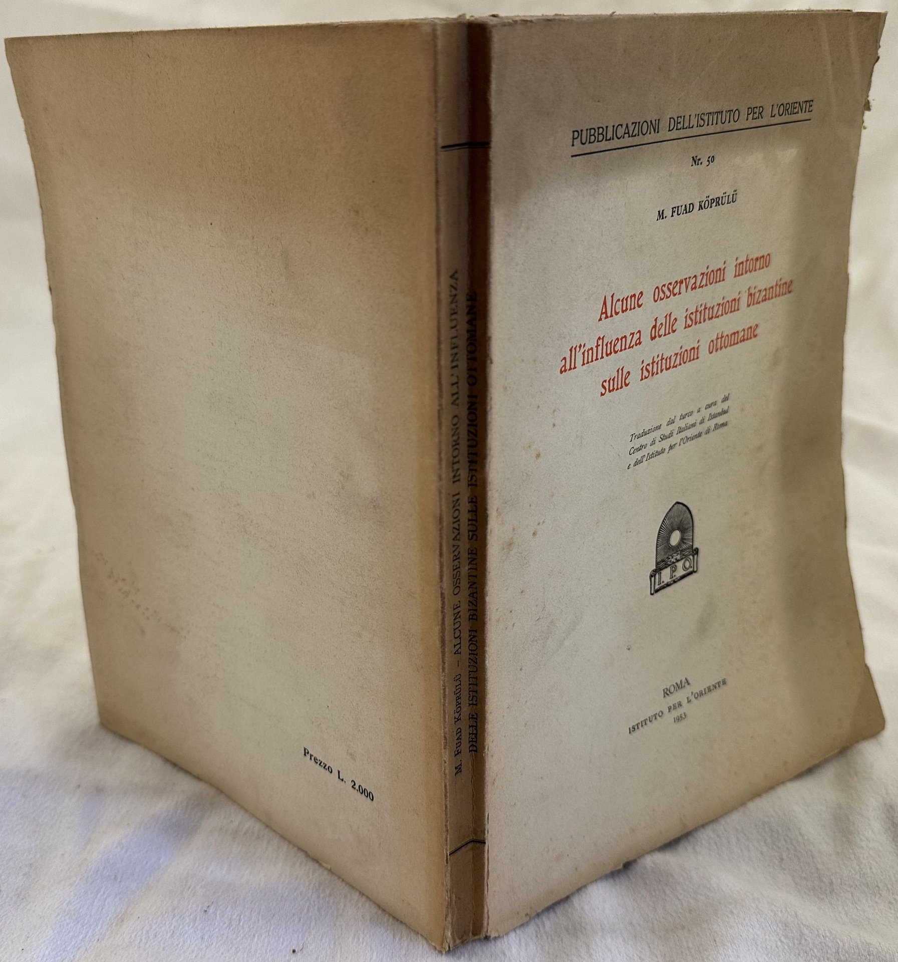 Interessante pubblicazione del 1953 della collana "Pubblicazioni dell'Istituto per l'Oriente", alcune osservazioni intorno all'influenza delle istituzioni bizantine sulle istituzioni ottomane a cura di Fuad Koprulu. Traduzione dal turco a cura del Centro di Studi Italiani di Istanbul e dell'Istituto per l'Oriente di Roma. Firma datata 1970 al frontespizio. All'interno: Opinioni circa l'influenza di Bisanzia sulle istituzioni ottomane; Come e dove vanno cercate le origini delle istituzioni ottomane; Origine delle varie istituzioni che si pretendono essere passate da Bisanzio agli Ottomani. Loro evoluzionefino alla conquista di Costantinopoli; bibliografia ec. In buone condizioni. Copertina editoriale in discrete condizioni con lievi usure ai margini e dorso. Alcune macchie. Legatura in discrete condizioni con qualche lieve rottura. Pagine in buone condizioni con fioriture. In 8. Cm 25,5x18. Pp. (4)+174. Interesting pamphlet of 1953 of the series "Pubbliczioni dell'Istituto per l'Oriente", some obsevartions about the influence of bizantine institutions on ottoman institutions by Fuad Koprulu. Translation from turkish language by Centro di Studi Italiani di Istanbul e dell'Istituto per l'Oriente di Roma. Signature dated 1970 in the title page. In good conditions. Editorial cover in fair conditons lightly worn in the extremities. Some stains. Binding in fair condition with some light crack. Pages in good conditions with foxing. In 8. Cm 25,5x18. Pp. (4)+174.