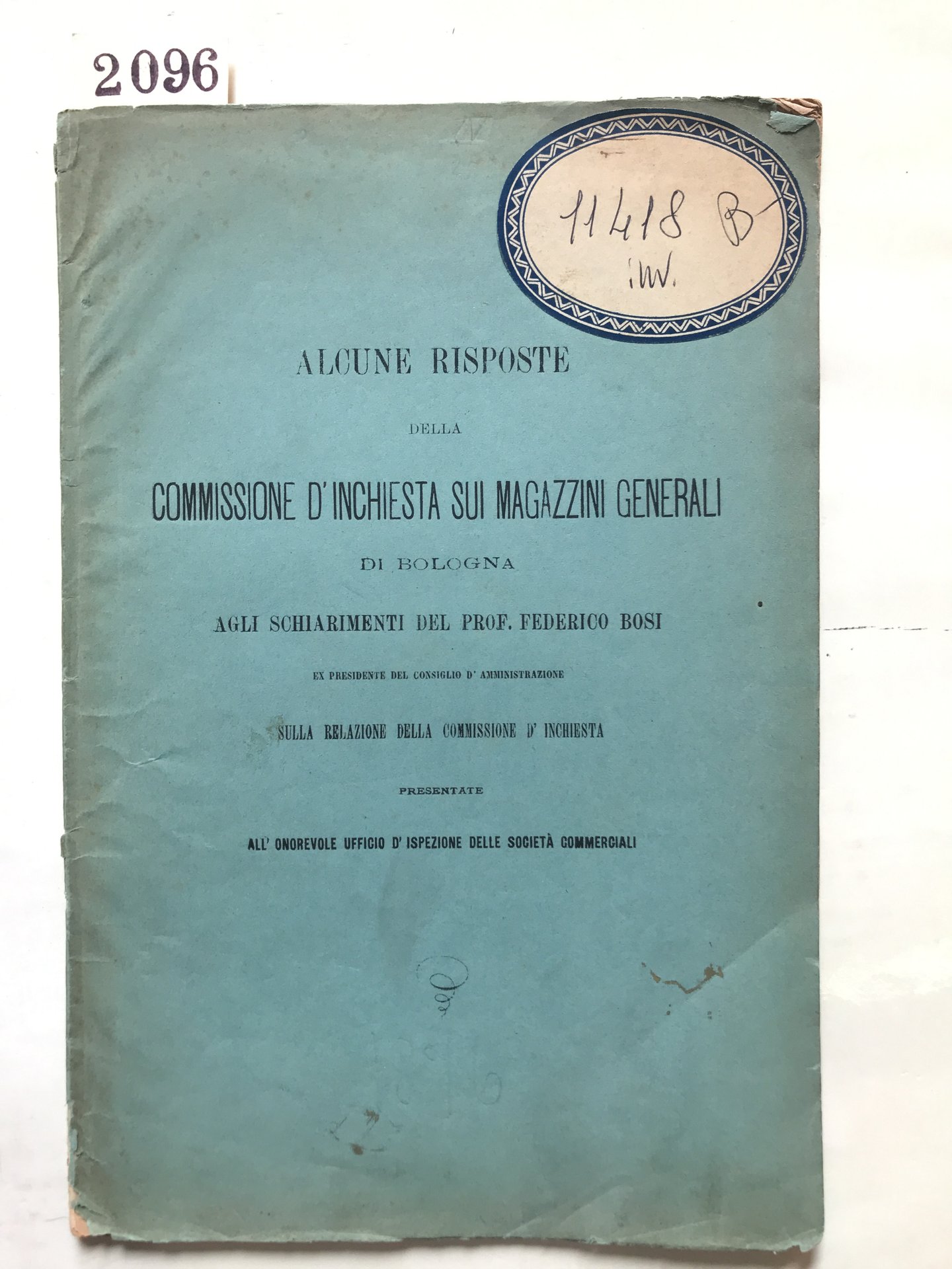 ALCUNE RISPOSTE DELLA COMMISSIONE D'INCHIESTA SUI MAGAZZINI GENERALI DI BOLOGNA. Agli schiarimenti del Prof. Federico BOSI, sulla relazione della Commissione d'inchiesta presentata all' Onorevole Ufficio d'Ispezione delle Societa Commerciali.