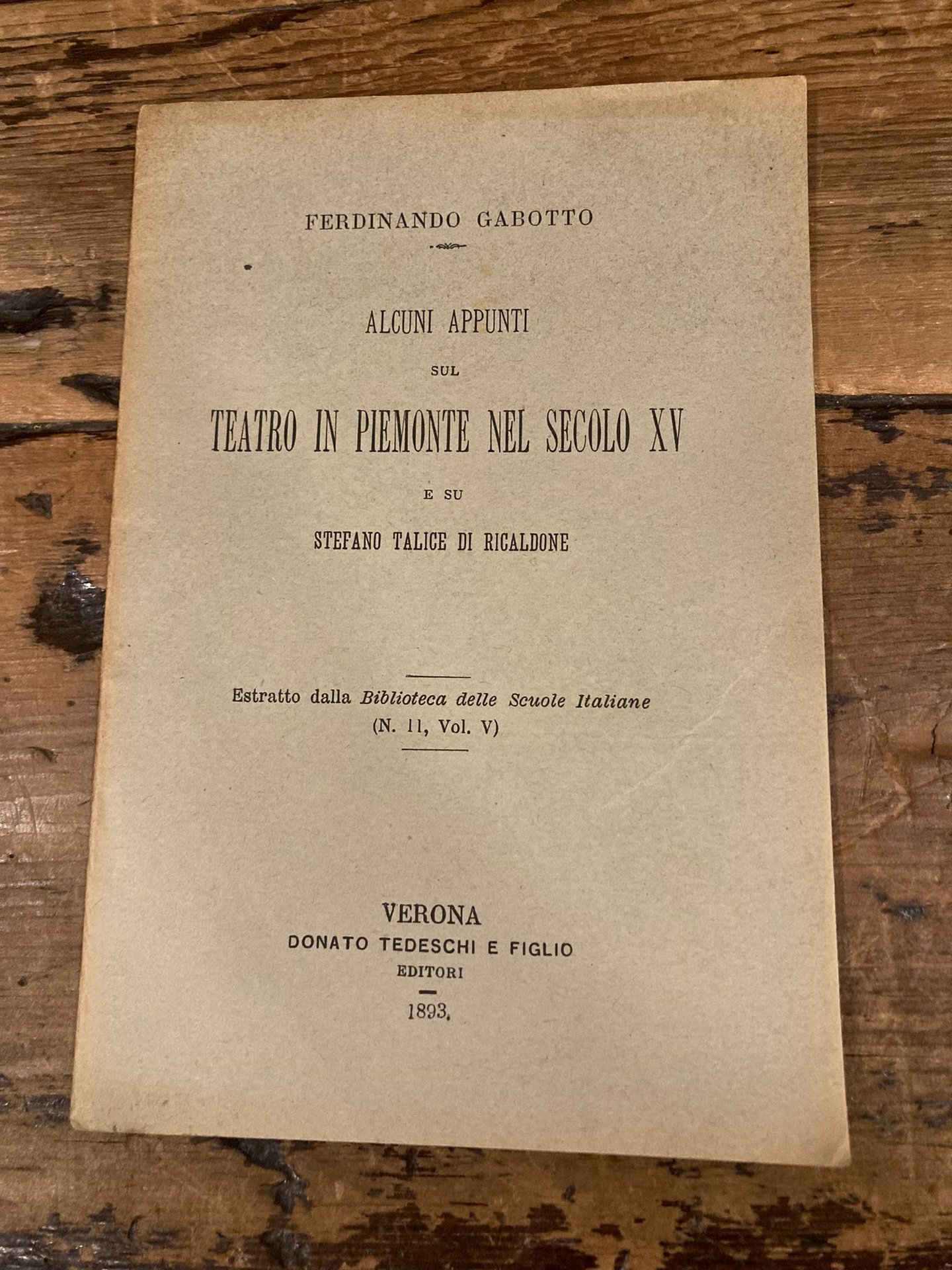 In-16° (18x12 cm), pp. 17 (1), brossura editoriale con titoli al piatto anteriore. Più che buon esemplare. Non comune memoria sotto forma di estratto dalla Bibliotca delle Scuole italiane (N. 11, Vol. V), fascicolo 2. F. Gabotto (Torino, 1866-ivi, 1918) fu soprattutto illustre cultore di storia locale piemontese e di storia medievale. Fondatore con il Rinaudo della 'Rivista Storica Italiana', diresse anche la Società Storica Subalpina e fu professore nelle scuole secondarie a Torino e nelle Università di Messina e di Genova. La sua amplissima bibliografia comprende oltre 700 lavori.