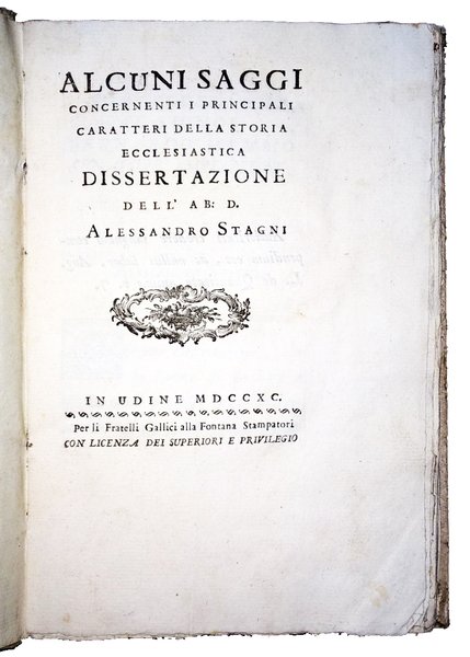 in-8° (220x146 mm), leg. coeva in cartonato grezzo; pp. VI, 264; frontespizio a caratteri neri con vignetta; testatine e capilettera finemente incisi e decorati. Dedica dell'Autore al Senatore Bernardo Memmo. Raccolta di considerazioni di carattere filosofico sulla storia della Chiesa e della religione. Rif.: IT\ICCU\RAVE\006595 (6 copie). OCLC, 165912140. Cond.: Tracce d'uso alla leg. (alcune macchie, un piccolo foro al piatto posteriore, leggera spaccatura alla cerniera posteriore in corripondenza della cuffia superiore). Carte spesse e croccanti, in barbe, con un testo marginoso; presenza di rare macchie. Esemplare nel complesso molto buono.