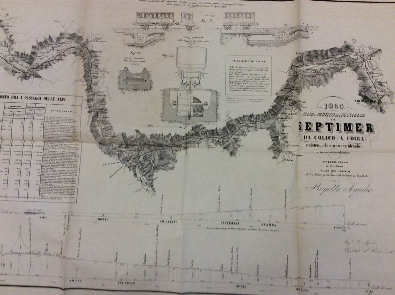 In-4 gr. (mm. 370x242), brossura originale, pp. 23, con 1 grande tavola litografata (cm. 85x58 al vivo) che rappresenta il Piano e profilo del Passaggio del Septimer da Colico a Coira e sistema di locomozione idraulica a trave rimorchiatore. Al centro della tavola è riportata la parte topografica del percorso, in basso il profilo altimetrico e in alto il locomotore col sistema idraulico; a sinistra una tabella con il confronto fra i passaggi delle Alpi: Lucmagno (da Bellinzona a Coira) - Spluga (da Domaso a Coira) e Septimer (da Colico a Coira) il solo che potrà soddisfare simultaneamente ai migliori interessi dei porti del Mediterraneo e dell'Adriatico e delle piazze principali del commercio italiano. Lievi fioriture, ma complessivam. ben conservato.
