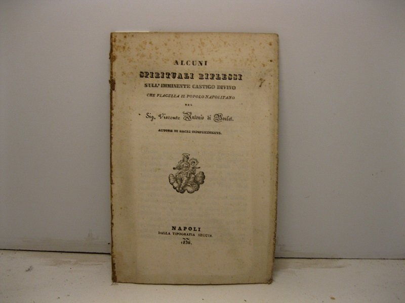 In 8, pp. 38 + (2b). P. post. orig. P. ant. rifatto. Considerazioni dell'A. sull'epidemia di colera che sconvolse Napoli in due successive ondate fra 1836 e 1837, vista come punizione divina per i peccati degli uomini e preghiera da recitarsi per ogni Cristiano minacciato dalla malattia.