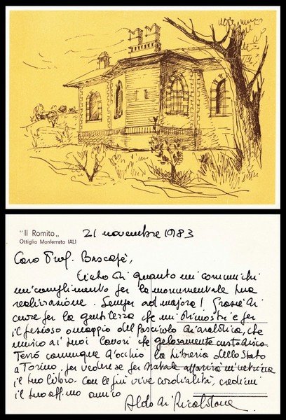 cartolina manoscritta e firmata di Aldo di Ricaldone datata 21 Novembre 1983 riproducente al verso il Romito di Ottiglio Monferrato (AL); buon es.