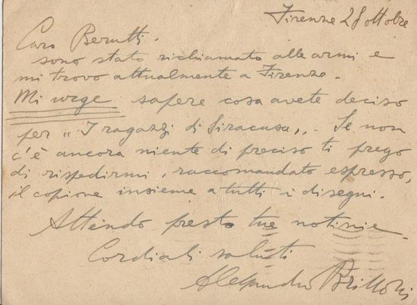 intero postale manoscritto e firmato di Alessandro Brissoni datato Firenze, 28 ottobre 1942; buon es.