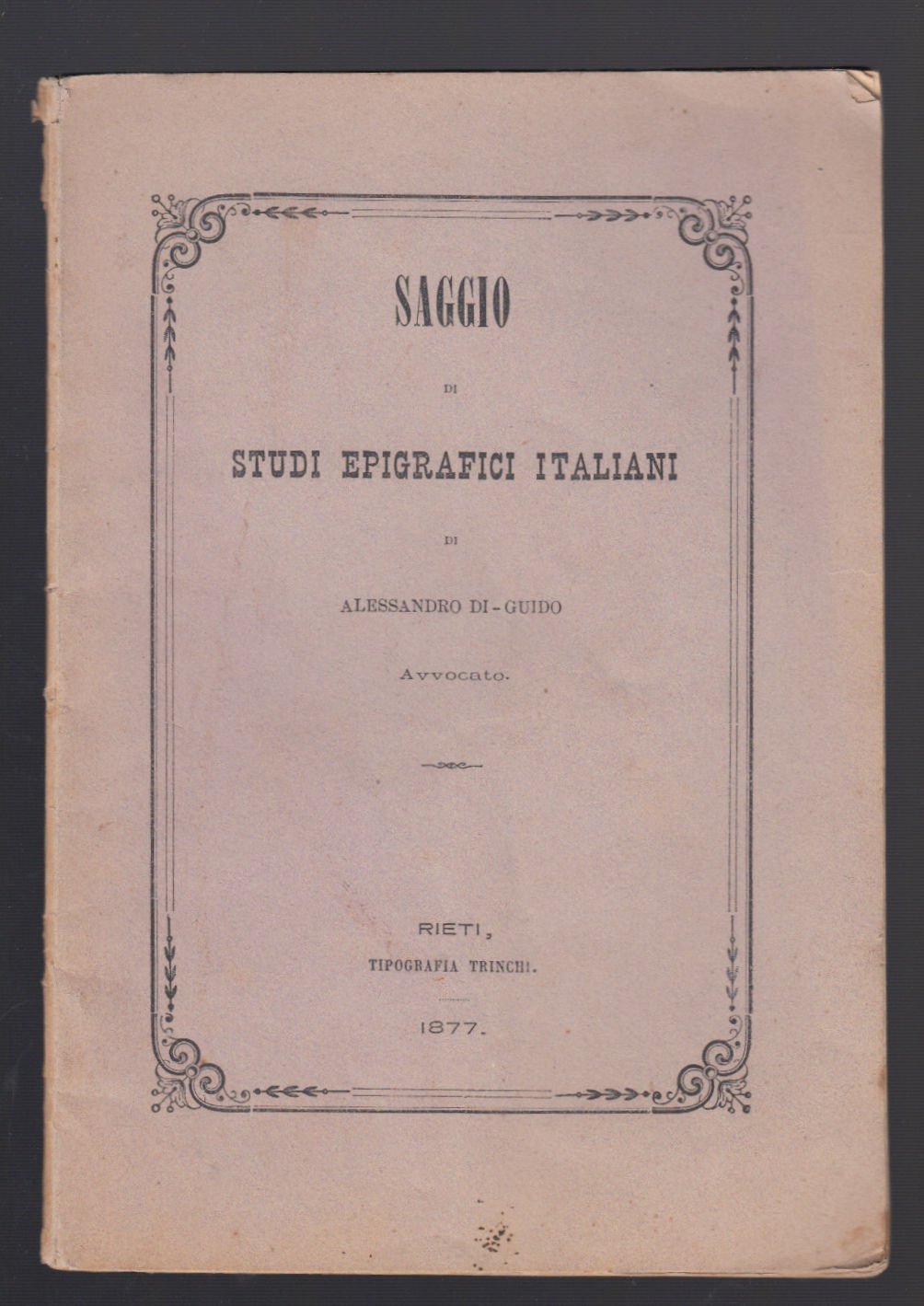 AVV. ALESSANDRO DI GUIDO SAGGIO DI STUDI EPIGRAFICI ITALIANI RIETI TIPOGRAFIA TRINCHI 1877 COPERTINA FLESSIBILE CON UN PICCOLO STRAPPO AL MARGINE DESTRO DEL PIATTO, INTERNO IN BUONO STATO CON QUALCHE FIORITURA, LEGATURA LEGGERMENTE ALLENTATA N. PAG. 43 CM. 21 X 14,5 ALTRA COPIA DISPONIBILE CON DIFETTI ALLA COPERTINA COPERTINA FLESSIBILE CON PICCOLE MACCHIE E SCRITTE COEVE, DORSO CON SPELLATURE, INTERNO IN DISCRETO STATO CON FIORITURE