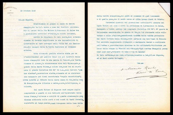 comunicazione firmata del Vescovo Alessandro Macchi di 2 facciate datata 18 ottobre 1940 con relative domande e risposte.; buoni ess.