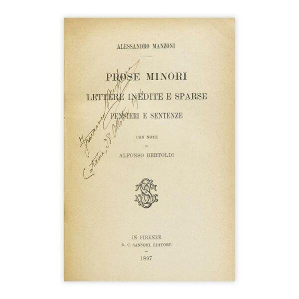 Autore: Alessandro Manzoni Titolo: Prose Minori Sottotitolo: Lettere inedite e sparse - Pensieri e sentenze con note di Alfonso Bertoldi Edizione: G. C. Sansoni Editore, Firenze 1897 Dimensioni: 13,5 x 20 cm c.a. Pagine: 470 Copertina: Cartonato Condizioni: Ottime come da foto