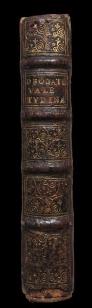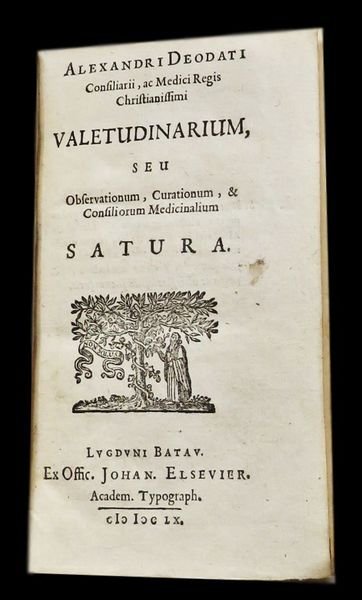 In 12° (12,8x7,5 cm); (16), 402, (2) pp. Bella legatura coeva in piena pelle scura marmorizzata con dorso a 4 nervi e titolo e ricchissimi fregi in oro allo stesso. Qualche piccolo difetto ai margini del dorso. Tagli spruzzati in rosso. Marca tipografica al frontespizio con motto "Non Solus". Testatine e iniziali xilografiche. Esemplare in buone-ottime condizioni di conservazione. Prima edizione stampata da Johannes Elzevier di quest'opera del noto medico ginevrino discendete da una famiglia protestante lucchese, Alexander Deodatus. L'autore fu medico ufficiale della "Chambre de la Santé" di Ginevra e amico personale di John Milton. L'opera è una guida per il mantenimento della buona salute con descrizione di numerose malattie e ritrovati farmaceutici per curarle. Prima edizione rara, un solo esemplare censito in ICCU e in buone-ottime condizioni di conservazione. First edition, good copy. Bibl.: Krivatsy 3108. Osler 2440. Wellcome II, 450. Willems, Les Elzevier (1880), 861.