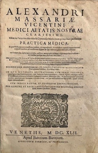Alexandri Massariae vicentini. Practica medica. Liber praeterea accessit Renum, & Vesicae affectus omnes Laconica brevitate complectens. Appositi insuper praeter Medicam in Febre Catarrali cuiusdam illustrissimi Antistitis habitam consultationem duo ad caldem Operis de Peste fuerunt libelli. Necnon Liber Responsorum, et Consultationum Medicinalium nunc primum collectus, & in lucem editus.